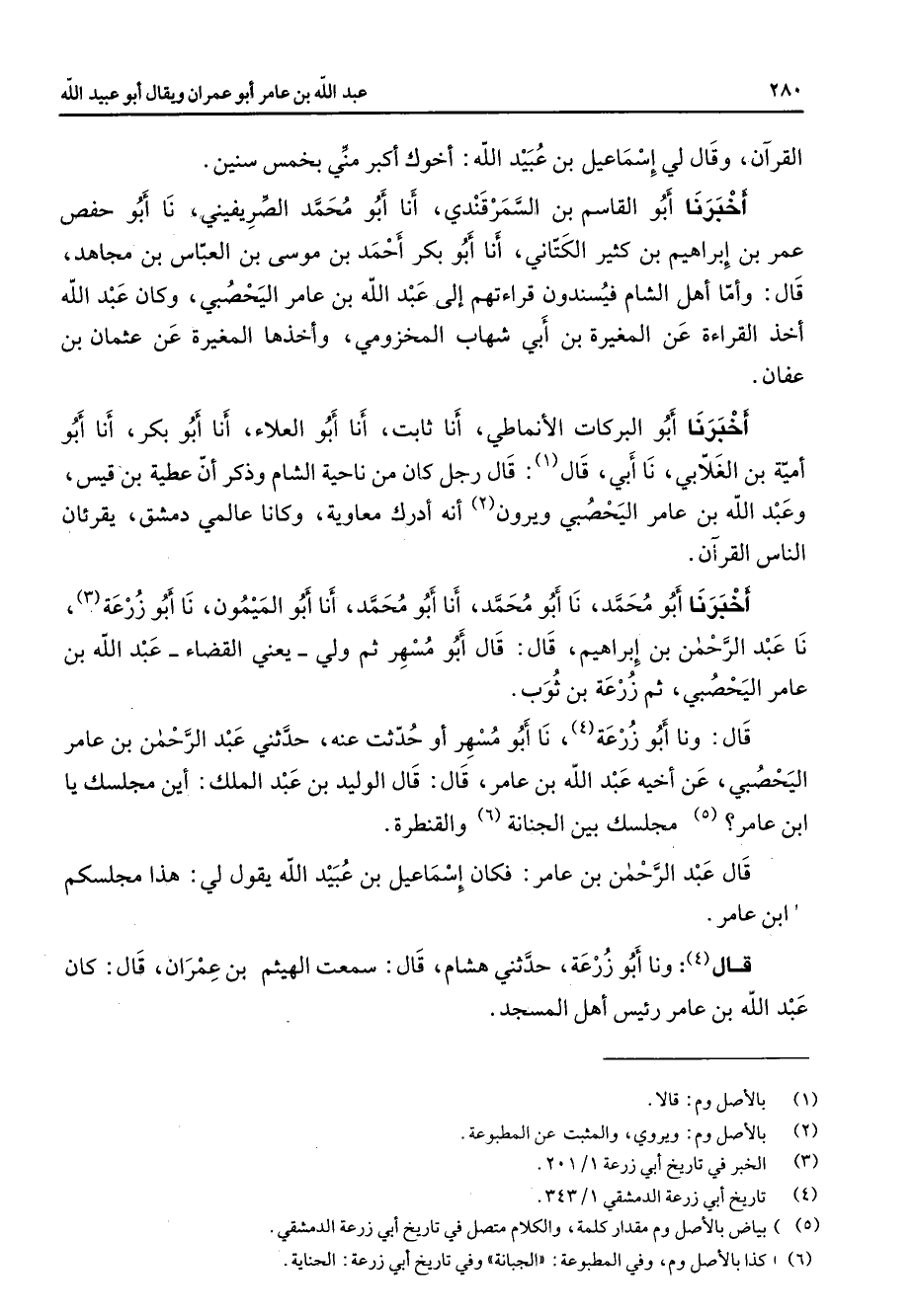 القرآن وقال لي إسماعيل بن عبيد الله أخوك أكبر مني بخمس سنين أخبرنا أبو القاسم بن السمرقندي أنا أبو محمد الصريفيني نا أبو حفص عمر بن إبراهيم بن كثير الكتاني أنا أبو بكر أحمد بن موسى بن العباس بن مجاهد قال وأما أهل الشام فيسندون قراءتهم إلى عبد الله بن عامر اليحصبي وكان عبد الله أخذ القراءة عن المغيرة بن أبي شهاب المخزومي وأخذها المغيرة عن عثمان بن عفان أخبرنا أبو البركات الأنماطي أنا ثابت أنا أبو العلاء أنا أبو بكر أنا أبو أمية بن الغلابي نا أبي قال (1) قال رجل كان من ناحية الشام وذكر أن عطية بن قيس وعبد الله بن عامر اليحصبي ويرون (2) أنه أدرك معاوية وكانا عالمي دمشق يقرئان الناس القرآن أخبرنا أبو محمد نا أبو محمد أنا أبو محمد أنا أبو الميمون نا أبو زرعة (3) نا عبد الرحمن بن إبراهيم قال قال أبو مسهر ثم ولي يعني القضاء عبد الله بن عامر اليحصبي ثم زرعة بن ثوب قال ونا أبو زرعة (4) نا أبو مسهر أو حدثت عنه حدثني عبد الرحمن بن عامر اليحصبي عن أخيه عبد الله بن عامر قال قال الوليد بن عبد الملك أين مجلسك يا ابن عامر (5) مجلسك بين الجنانة (6) والقنطرة قال عبد الرحمن بن عامر فكان إسماعيل بن عبيد الله يقول لي هذا مجلسكم ابن عامر قال (4) ونا أبو زرعة حدثني هشام قال سمعت الهيثم بن عمران قال كان عبد الله بن عامر رئيس أهل المسجد
