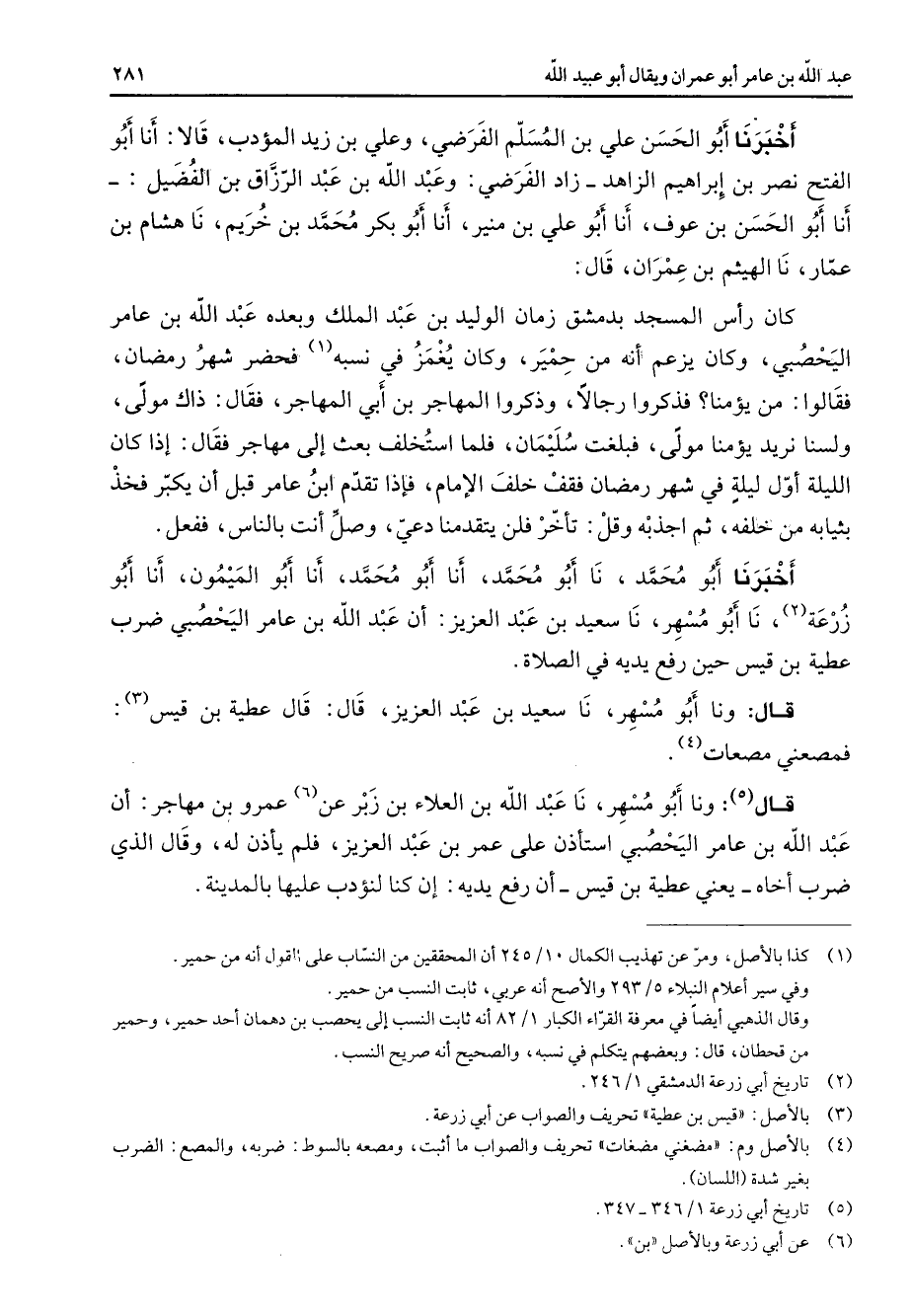 أخبرنا أبو الحسن علي بن المسلم الفرضي وعلي بن زيد المؤدب قالا أنا أبو الفتح نصر بن إبراهيم الزاهد زاد الفرضي وعبد الله بن عبد الرزاق بن الفضيل أنا أبو الحسن بن عوف أنا أبو علي بن منير أنا أبو بكر محمد بن خريم نا هشام بن عمار نا الهيثم بن عمران قال كان رأس المسجد بدمشق زمان الوليد بن عبد الملك وبعده عبد الله بن عامر اليحصبي وكان يزعم أنه من حمير وكان يغمز في نسبه (1) فحضر شهر رمضان فقالوا من يؤمنا فذكروا رجالا وذكروا المهاجر بن أبي المهاجر فقال ذاك مولى ولسنا نريد يؤمنا مولى فبلغت سليمان فلما استخلف بعث إلى مهاجر فقال إذا كان الليلة أول ليلة في شهر رمضان فقف خلف الإمام فإذا تقدم ابن عامر قبل أن يكبر فخذ بثيابه من خلفه ثم اجذبه وقل تأخر فلن يتقدمنا دعي وصل أنت بالناس ففعل أخبرنا أبو محمد نا أبو محمد أنا أبو محمد أنا أبو الميمون أنا أبو زرعة (2) نا أبو مسهر نا سعيد بن عبد العزيز أن عبد الله بن عامر اليحصبي ضرب عطية بن قيس حين رفع يديه في الصلاة قال وأنا أبو مسهر نا سعيد بن عبد العزيز قال قال عطية بن قيس (3) فمصعني مصعات (4) قال (5) ونا أبو مسهر نا عبد الله بن العلاء بن زبر عن (6) عمرو بن مهاجر أن عبد الله بن عامر اليحصبي استأذن على عمر بن عبد العزيز فلم يأذن له وقال الذي ضرب أخاه يعني عطية بن قيس أن رفع يديه إن كنا لنؤدب عليها بالمدينة
