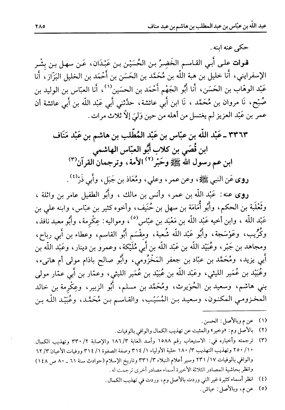 3363 - عبد الله بن عباس بن عبد المطلب بن هاشم بن عبد مناف ابن قصي بن كلاب أبو العباس الهاشمي ابن عم رسول الله (صلى الله عليه وسلم) وحبر (2) الأمة وترجمان القرآن (3) روى عن النبي (صلى الله عليه وسلم) وعن عمر وعلي ومعاذ بن جبل وأبي ذر (4) روى عنه عبد الله بن عمر وأنس بن مالك وأبو الطفيل عامر بن واثلة وثعلبة بن الحكم وأبو أمامة بن سهل بن حنيف وأخوه كثير بن عباس وابنه علي بن عبد الله وابن أخيه عبد الله بن معبد بن عباس (5) ومواليه عكرمة وأبو معبد نافذ وكريب وعوسجة وأبو عبد الله شعبة ومقسم أبو القاسم وعطاء بن أبي رباح ومجاهد بن جبر وعبيد الله بن عبد الله بن أبي مليكة وعمرو بن دينار وعبد الله بن أبي يزيد ومحمد بن عباد بن جعفر المخزومي وأبو صالح باذام مولى أم هانئ وعبيد بن عمير الليثي وعبد الله بن عبيد بن عمير الليثي وعمار بن أبي عمار مولى بني هاشم وسعيد بن الحويرث ومحمد بن مسلم أبو الزبير وعكرمة بن خالد المخزومي المكنون وسعيد بن المسيب والقاسم بن محمد وعبيد الله بن