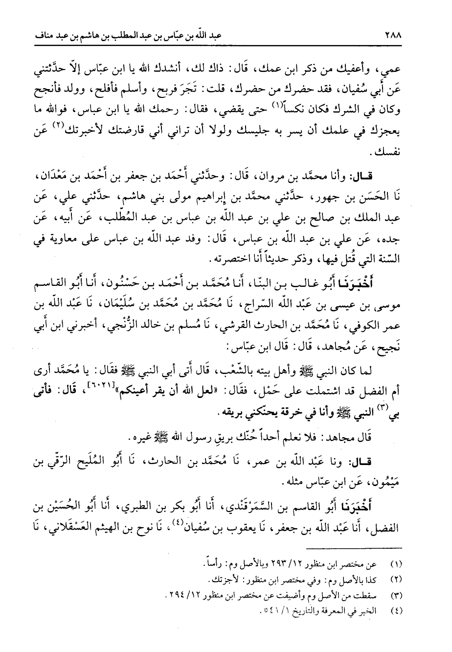 عمي وأعفيك عن ذكر ابن عمك قال ذاك لك أنشدك الله يا ابن عباس إلا حدثتني عن أبي سفيان فقد حضرك من حضرك قلت تجر فربح وأسلم فأفلح وولد فأنجح وكان في الشرك فكان نكسا (1) حتى يقضي فقال رحمك الله يا ابن عباس فوالله ما يعجزك في علمك أن يسر به جليسك ولولا أن تراني أني قارضتك لأخبرتك (2) عن نفسك قال وأنا محمد بن مروان قال وحدثني أحمد بن جعفر بن أحمد بن معدان نا الحسن بن جهور حدثني محمد بن إبراهيم مولى بني هاشم حدثني علي عن عبد الملك بن صالح بن علي بن عبد الله بن عباس بن عبد المطلب عن أبيه عن جده عن علي بن عبد الله بن عباس قال وفد عبد الله بن عباس على معاوية في السنة التي قتل فيها وذكر حديثا أنا اختصرته أخبرنا أبو غالب بن البنا أنا محمد بن أحمد بن حسنون أنا أبو القاسم موسى بن عيسى بن عبد الله السراج نا محمد بن محمد بن سليمان نا عبد الله بن عمر الكوفي نا محمد بن الحارث القرشي نا مسلم بن خالد الزنجي أخبرني ابن أبي نجيح عن مجاهد قال قال ابن عباس لما كان النبي (صلى الله عليه وسلم) وأهل بيته بالشعب قال أتى أبي النبي (صلى الله عليه وسلم) فقال يا محمد أرى أم الفضل قد اشتملت على حمل فقال لعل الله أن يقر أعينكم 6021 قال فأتى بي (3) النبي (صلى الله عليه وسلم) وأنا في خرقة يحنكني بريقه قال مجاهد فلا نعلم أحدا حنك بريق رسول الله (صلى الله عليه وسلم) غيره قال ونا عبد الله بن عمر نا محمد بن الحارث نا أبو المليح الرقي بن ميمون عن ابن عباس مثله أخبرنا أبو القاسم بن السمرقندي أنا أبو بكر بن الطبري أنا أبو الحسين بن الفضل أنا عبد الله بن جعفر نا يعقوب بن سفيان (4) نا نوح بن الهيثم العسقلاني نا