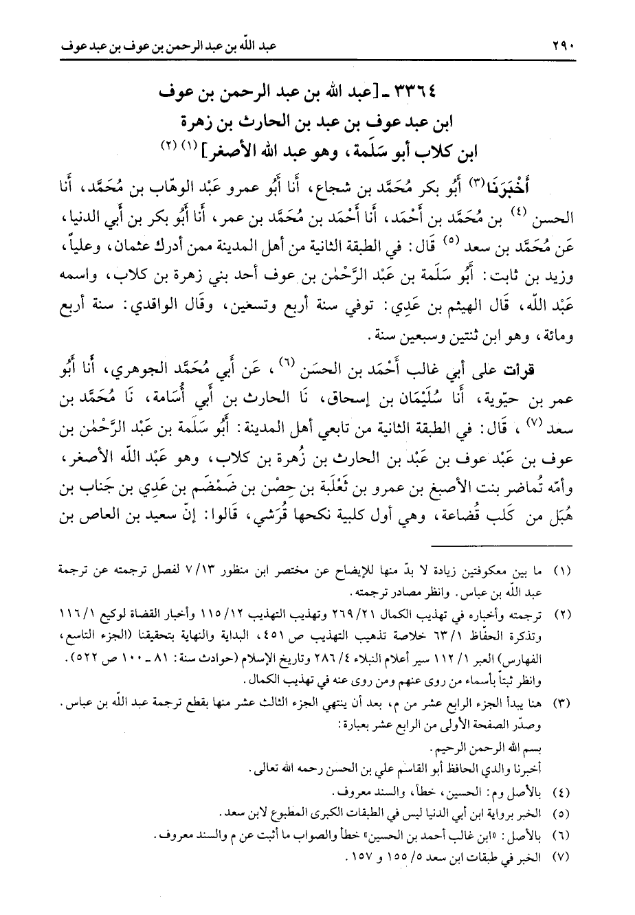 3364 - عبد الله بن عبد الرحمن بن عوف ابن عبد عوف بن عبد بن الحارث بن زهرة بن كلاب أبو سلمة وهو عبد الله الأصغر (1) (2) أخبرنا (3) أبو بكر محمد بن شجاع أنا أبو عمرو عبد الوهاب بن محمد أنا الحسن (4) بن محمد بن أحمد أنا أحمد بن محمد بن عمر انا أبو بكر بن أبي الدنيا عن محمد بن سعد (5) قال في الطبقة الثانية من أهل المدينة ممن أدرك عثمان وعليا وزيد بن ثابت أبو سلمة بن عبد الرحمن بن عوف أحد بني زهرة بن كلاب واسمه عبد الله قال الهيثم بن عدي توفي سنة أربع وتسعين وقال الواقدي سنة أربع ومائة وهو ابن ثنتين وسبعين سنة قرأت على أبي غالب أحمد بن الحسن (6) عن أبي محمد الجوهري انا أبو عمر بن حيوية أنا سليمان بن إسحاق نا الحارث بن أبي أسامة نا محمد بن سعد (7) قال في الطبقة الثانية من تابعي أهل المدينة أبو سلمة بن عبد الرحمن بن عوف بن عبد عوف بن عبد بن الحارث بن زهرة بن كلاب وهو عبد الله الأصغر وأمه تماضر بنت الأصبغ بن عمرو بن ثعلبة بن حصن بن ضمضم بن عدي بن جناب بن هبل من كلب قضاعة وهي أول كلبية نكحها قرشي قالوا إن سعيد بن العاص بن