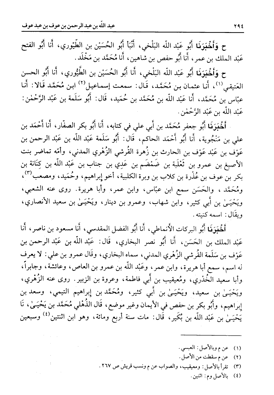 ح وأخبرنا أبو عبد الله البلخي أنبأ أبو الحسين بن الطيوري أنا أبو الفتح عبد الملك بن عمر أنا أبو حفص بن شاهين أنا محمد بن مخلد ح وأخبرنا أبو عبد الله البلخي أنا أبو الحسين بن الطيوري أنا أبو الحسن العتيقي (1) أنا عثمان بن محمد قال سمعت إسماعيل (2) ابن محمد قالا أنا عباس بن محمد أنا عبد الله بن محمد بن حميد قال أبو سلمة بن عبد الرحمن عبد الله بن عبد الرحمن أخبرنا أبو جعفر محمد بن أبي علي في كتابه أنا أبو بكر الصفار أنا أحمد بن علي بن منجويه أنا أبو أحمد الحاكم قال أبو سلمة عبد الله بن عبد الرحمن بن عوف بن عبد عوف بن الحارث بن زهرة القرشي الزهري المدني وأمه تماضر بنت الأصبغ بن عمرو بن ثعلبة بن ضمضم بن عدي بن جناب بن عبد الله بن كنانة بن بكر بن عوف بن عذرة بن كلاب بن وبرة الكلبية أخو إبراهيم وحميد ومصعب (3) ومحمد والحسن سمع ابن عباس وابن عمر وأبا هريرة روى عنه الشعبي ويحيى بن أبي كثير وابن شهاب وعمرو بن دينار ويحيى بن سعيد الأنصاري ويقال اسمه كنيته أخبرنا أبو البركات الأنماطي أنا أبو الفضل المقدسي أنا مسعود بن ناصر أنا عبد الملك بن الحسن أنا أبو نصر البخاري قال عبد الله بن عبد الرحمن بن عوف بن سلمة القرشي الزهري المدني سماه البخاري وقال عمرو بن علي لا يعرف له اسم سمع أبا هريرة وابن عمر وعبد الله بن عمرو بن العاص وعائشة وجابرا وأبا سعيد الخدري ومعيقيب بن أبي فاطمة وعروة بن الزبير روى عنه الزهري ويحيى بن سعيد ويحيى بن أبي كثير ومحمد بن إبراهيم التيمي وسعد بن إبراهيم وأبو بكر بن حفص في الأيمان وغير موضع قال الذهلي محمد بن يحيى نا يحيى بن عبد الله بن بكير قال مات سنة أربع ومائة وهو ابن اثنتين (4) وسبعين