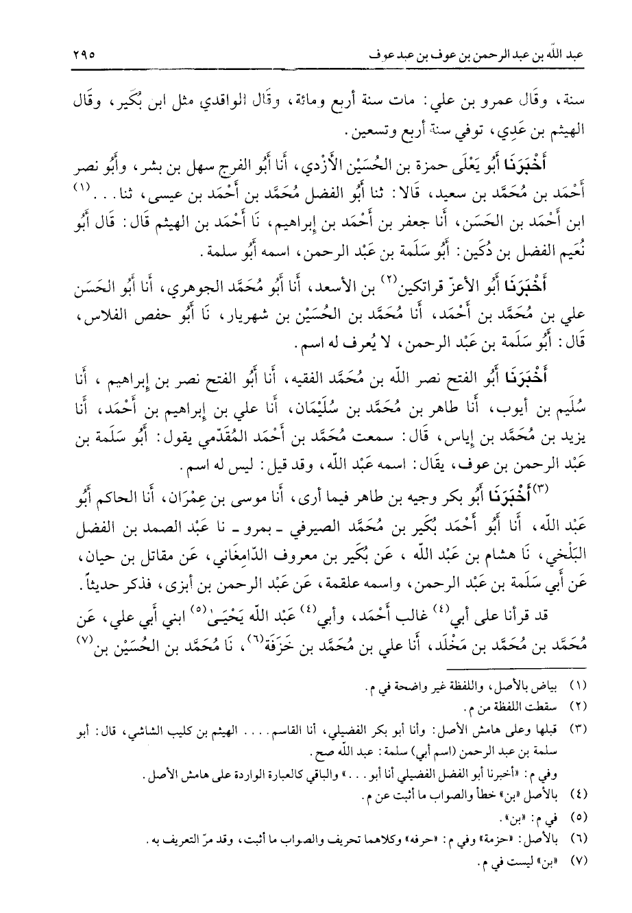 (1) ابن أحمد بن الحسن أنا جعفر بن أحمد بن إبراهيم نا أحمد بن الهيثم قال قال أبو نعيم الفضل بن دكين أبو سلمة بن عبد الرحمن اسمه أبو سلمة أخبرنا أبو الأعز قراتكين (2) بن الأسعد أنا أبو محمد الجوهري أنا أبو الحسن علي بن محمد بن أحمد أنا محمد بن الحسين بن شهريار نا أبو حفص الفلاس قال أبو سلمة بن عبد الرحمن لا يعرف له اسم أخبرنا أبو الفتح نصر الله بن محمد الفقيه أنا أبو الفتح نصر بن إبراهيم أنا سليم بن أيوب أنا طاهر بن محمد بن سليمان أنا علي بن إبراهيم بن أحمد أنا يزيد بن محمد بن إياس قال سمعت محمد بن أحمد المقدمي يقول أبو سلمة بن عبد الرحمن بن عوف يقال اسمه عبد الله وقد قيل ليس له اسم (3) أخبرنا أبو بكر وجيه بن طاهر فيما أرى أنا موسى بن عمران أنا الحاكم أبو عبد الله أنا أبو أحمد بكير بن محمد الصيرفي بمرو نا عبد الصمد بن الفضل البلخي نا هشام بن عبد الله عن بكير بن معروف الدامغاني عن مقاتل بن حيان عن أبي سلمة بن عبد الرحمن واسمه علقمة عن عبد الرحمن بن أبزى فذكر حديثا قد قرأنا على أبي (4) غالب أحمد وأبي (4) عبد الله يحيى (5) ابني أبي علي عن محمد بن محمد بن مخلد أنا علي بن أحمد بن خزفة (6) نا محمد بن الحسين بن (7)