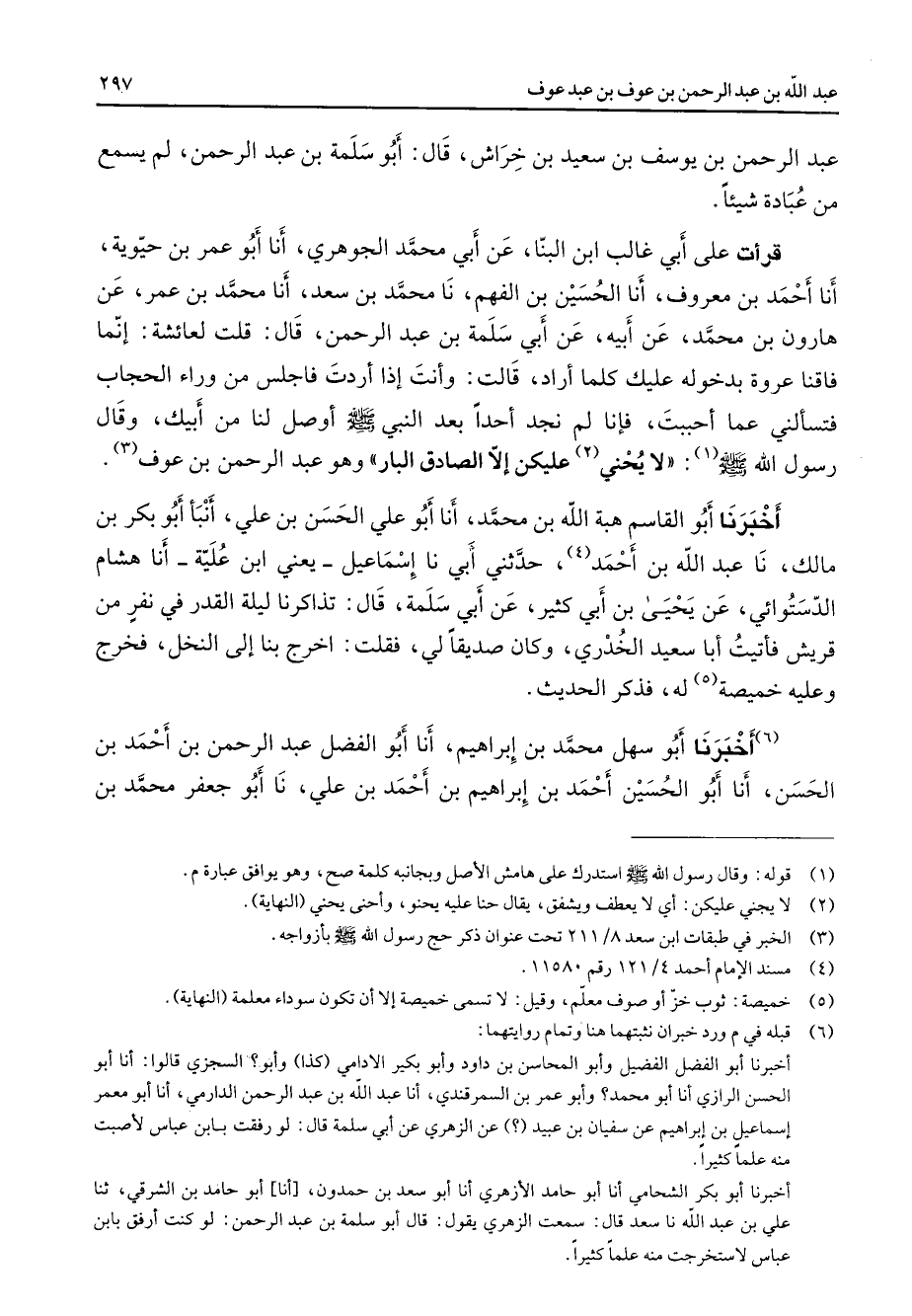 عبد الرحمن بن يوسف بن سعيد بن خراش قال أبو سلمة بن عبد الرحمن لم يسمع من عبادة شيئا قرأت على أبي غالب بن البنا عن أبي محمد الجوهري أنا أبو عمر بن حيوية أنا أحمد بن معروف أنا الحسين بن الفهم نا محمد بن سعد أنا محمد بن عمر عن هارون بن محمد عن أبيه عن أبي سلمة بن عبد الرحمن قال قلت لعائشة إنما فاقنا عروة بدخوله عليك كلما أراد قالت وأنت إذا أردت فاجلس من وراء الحجاب فتسألني عما أحببت فإنا لم نجد أحدا بعد النبي (صلى الله عليه وسلم) أوصل لنا من أبيك وقال رسول الله (صلى الله عليه وسلم) (1) لا يحني (2) عليكن إلا الصادق البار وهو عبد الرحمن بن عوف (3) أخبرنا أبو القاسم هبة الله بن محمد أنا أبو علي الحسن بن علي أنبأ أبو بكر بن مالك نا عبد الله بن أحمد (4) حدثني أبي أنا إسماعيل يعني ابن علية أنا هشام الدستوائي عن يحيى ابن أبي كثير عن أبي سلمة قال تذاكرنا ليلة القدر في نفر من قريش فأتيت أبا سعيد الخدري وكان صديقا لي فقلت اخرج بنا إلى النخل فخرج وعليه خميصة له (5) فذكر الحديث (6) أخبرنا أبو سهل محمد بن إبراهيم أنا أبو الفضل عبد الرحمن بن أحمد بن الحسن أنا أبو الحسين أحمد بن إبراهيم بن أحمد بن علي نا أبو جعفر محمد بن