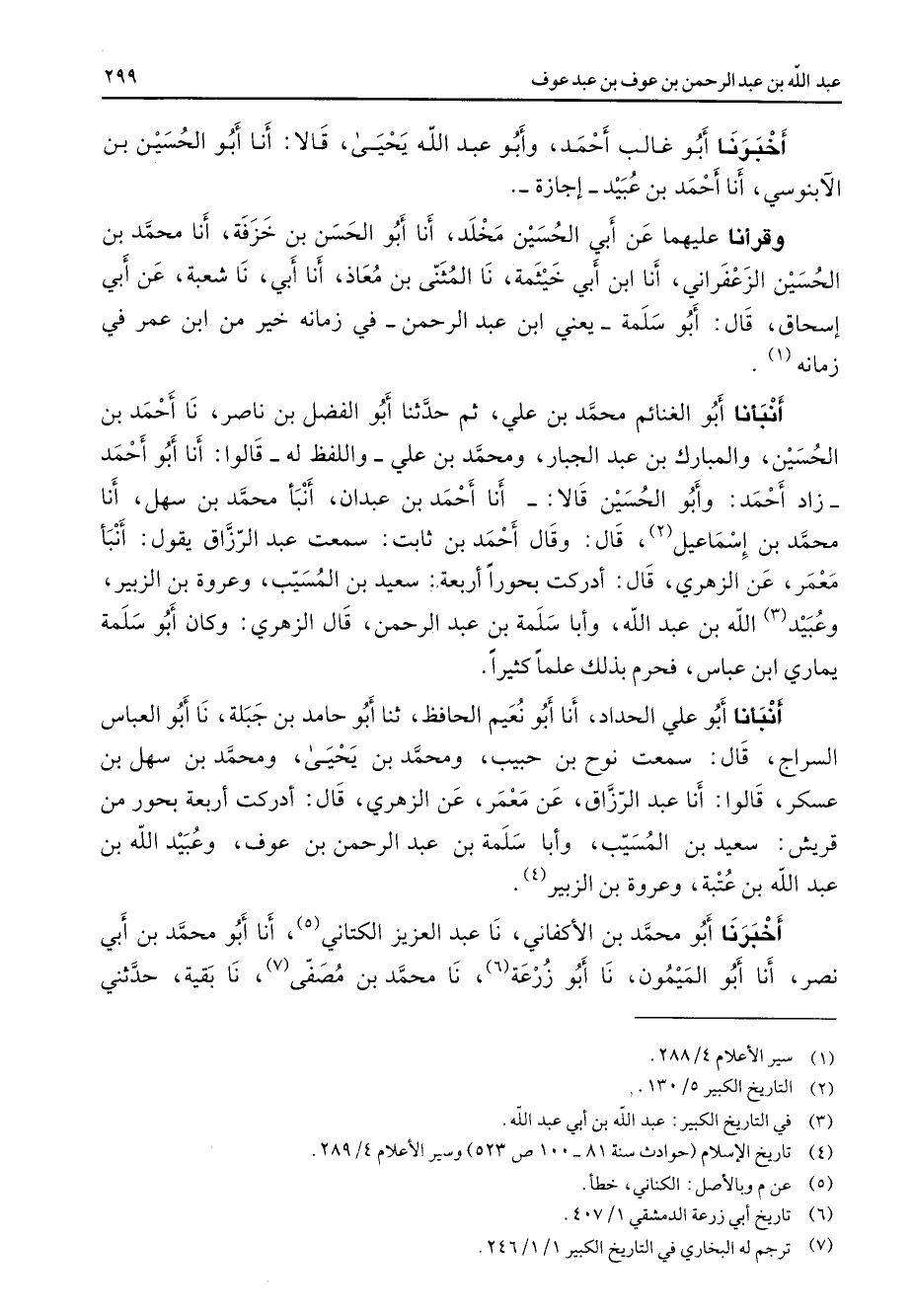 أخبرنا أبو غالب أحمد وأبو عبد الله يحيى قالا أنا أبو الحسين بن الآبنوسي أنا أحمد بن عبيد إجازة وقرأنا عليهما عن أبي الحسين مخلد أنا أبو الحسن بن خزفة أنا محمد بن الحسين الزعفراني أنا ابن أبي خيثمة نا المثنى بن معاذ أنا أبي نا شعبة عن أبي إسحاق قال أبو سلمة يعني ابن عبد الرحمن في زمانه خير من ابن عمر في زمانه (1) أنبأنا أبو الغنائم محمد بن علي ثم حدثنا أبو الفضل بن ناصر نا أحمد بن الحسين والمبارك بن عبد الجبار ومحمد بن علي واللفظ له قالوا أنا أبو أحمد زاد أحمد وأبو الحسين قالا أنا أحمد بن عبدان أنبأ محمد بن سهل أنا محمد بن إسماعيل (2) قال وقال أحمد بن ثابت سمعت عبد الرزاق يقول أنبأ معمر عن الزهري قال أدركت بحورا أربعة سعيد بن المسيب وعروة بن الزبير وعبيد (3) الله بن عبد الله وأبا سلمة بن عبد الرحمن قال الزهري وكان أبو سلمة يماري ابن عباس فحرم بذلك علما كثيرا أنبأنا أبو علي الحداد أنا أبو نعيم الحافظ ثنا أبو حامد بن جبلة نا أبو العباس السراج قال سمعت نوح بن حبيب ومحمد بن يحيى ومحمد بن سهل بن عسكر قالوا أنا عبد الرزاق عن معمر عن الزهري قال أدركت أربعة بحور من قريش سعيد بن المسيب وأبا سلمة بن عبد الرحمن بن عوف وعبيد الله بن عبد الله بن عتبة وعروة بن الزبير (4) أخبرنا أبو محمد بن الأكفاني نا عبد العزيز الكتاني (5) أنا أبو محمد بن أبي نصر أنا أبو الميمون نا أبو زرعة (6) نا محمد بن مصفى (7) نا بقية حدثني