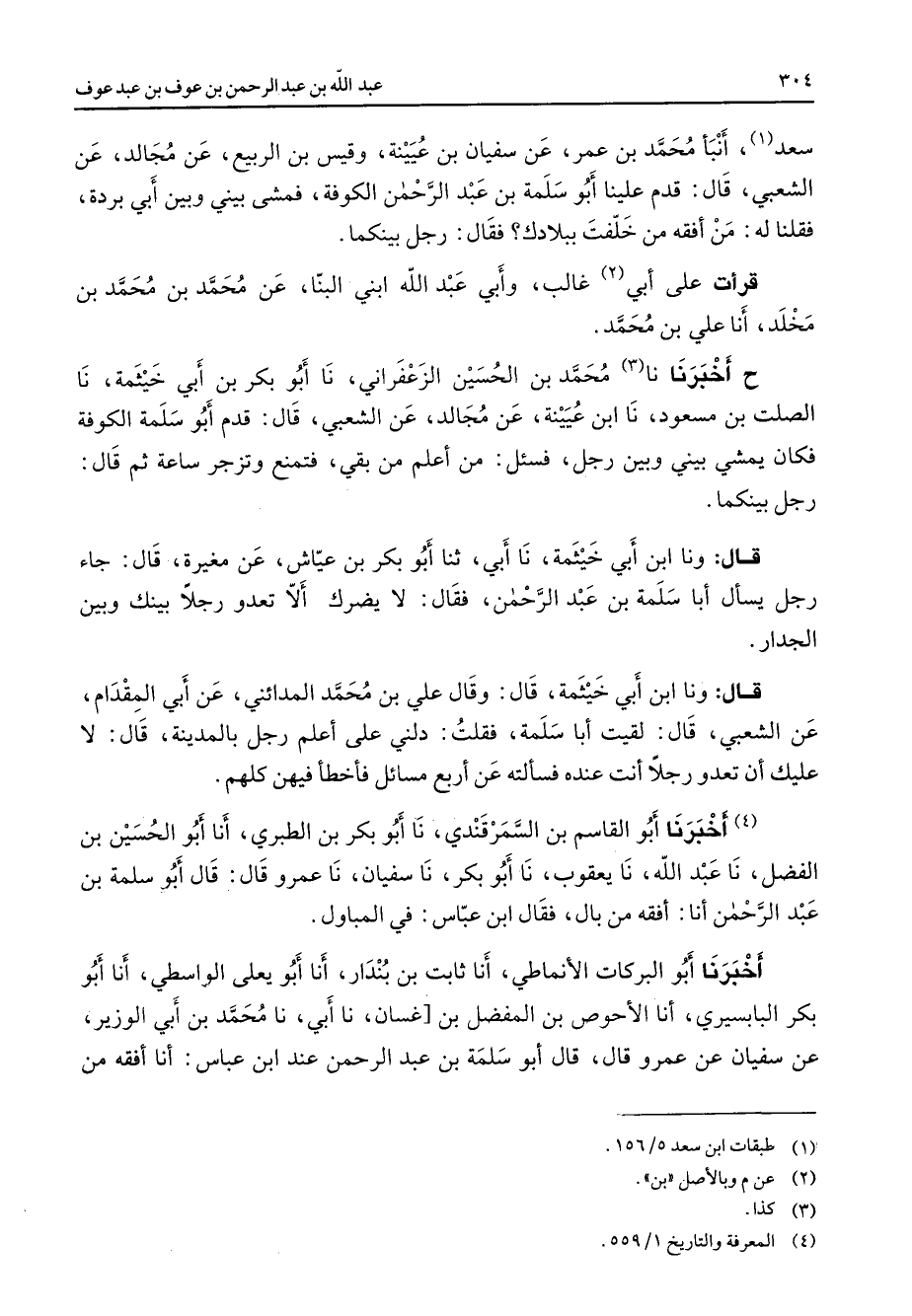 سعد (1) أنبأ محمد بن عمر عن سفيان بن عيينة وقيس بن الربيع عن مجالد عن الشعبي قال قدم علينا أبو سلمة بن عبد الرحمن الكوفة فمشى بيني وبين أبي بردة فقلنا له من أفقه من خلفت ببلادك فقال رجل بينكما قرأت على أبي (2) غالب وأبي عبد الله ابني البنا عن محمد بن محمد بن مخلد أنا علي بن محمد ح أخبرنا نا (3) محمد بن الحسين الزعفراني نا أبو بكر بن أبي خيثمة نا الصلت بن مسعود نا ابن عيينة عن مجالد عن الشعبي قال قدم أبو سلمة الكوفة فكان يمشي بيني وبين رجل فسئل من اعلم من بقي فتمنع وتزجر ساعة ثم قال رجل بينكما قال ونا ابن أبي خيثمة نا أبي ثنا أبو بكر بن عياش عن المغيرة قال جاء رجل يسأل أبا سلمة بن عبد الرحمن فقال لا يضرك ألا تعدو رجلا بينك وبين الجدار قال ونا ابن أبي خيثمة قال وقال علي بن محمد المدائني عن أبي المقدام عن الشعبي قال لقيت أبا سلمة فقلت دلني على أعلم رجل بالمدينة قال لا عليك أن تعدو رجلا أنت عنده فسألته عن أربع مسائل فأخطأ فيهن كلهم (4) أخبرنا أبو القاسم بن السمرقندي نا أبو بكر بن الطبري أنا أبو الحسين بن الفضل نا عبد الله نا يعقوب نا أبو بكر نا سفيان نا عمرو قال قال أبو سلمة بن عبد الرحمن أنا أفقه من بال فقال ابن عباس في المباول أخبرنا أبو البركات الأنماطي أنا ثابت بن بندار أنا أبو يعلى الواسطي أنا أبو بكر البابسيري أنا الأحوص بن المفضل بن غسان نا أبي نا محمد بن أبي الوزير عن سفيان عن عمرو قال قال أبو سلمة بن عبد الرحمن عند ابن عباس أنا أفقه من