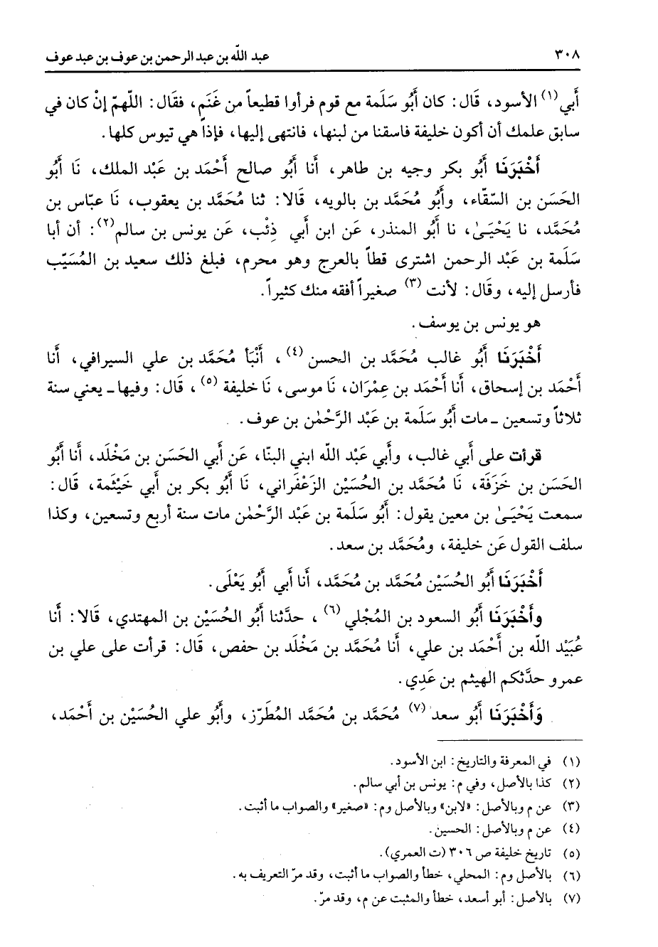 أبي (1) الأسود قال كان أبو سلمة مع قوم فرأوا قطيعا من غنم فقال اللهم إن كان في سابق علمك أن أكون خليفة فاسقنا من لبنها فانتهى إليها فإذا هي تيوس كلها أخبرنا أبو بكر وجيه بن طاهر أنا أبو صالح أحمد بن عبد الملك نا أبو الحسن بن السقاء وأبو محمد بالويه قالا ثنا محمد بن يعقوب نا عباس بن محمد نا يحيى نا أبو المنذر عن ابن أبي ذئب عن يونس بن سالم (2) أن أبا سلمة بن عبد الرحمن اشترى قطا بالعرج وهو محرم فبلغ ذلك سعيد بن المسيب فأرسل إليه وقال لأنت (3) صغيرا أفقه منك كثيرا هو يونس بن يوسف أخبرنا أبو غالب محمد بن الحسن (4) أنبأ محمد بن علي السيرافي أنا أحمد بن إسحاق أنا أحمد بن عمران نا موسى نا خليفة (5) قال وفيها يعني سنة ثلاثا وتسعين مات أبو سلمة بن عبد الرحمن بن عوف قرأت على أبي غالب وأبي عبد الله ابني البنا عن أبي الحسن بن مخلد أنا أبو الحسن بن خزفة نا محمد بن الحسين الزعفراني نا أبو بكر بن أبي خيثمة قال سمعت يحيى بن معين يقول أبو سلمة بن عبد الرحمن مات سنة أربع وتسعين وكذا سلف القول عن خليفة ومحمد بن سعد أخبرنا أبو الحسين محمد بن محمد أنا أبي أبو يعلى وأخبرنا أبو السعود بن المجلي (6) حدثنا أبو الحسين بن المهتدي قالا أنا عبيد الله بن أحمد بن علي أنا محمد بن مخلد بن حفص قال قرأت على علي بن عمرو حدثكم الهيثم بن عدي وأخبرنا أبو سعد (7) محمد بن ممحمد المطرز وأبو علي الحسين بن أحمد