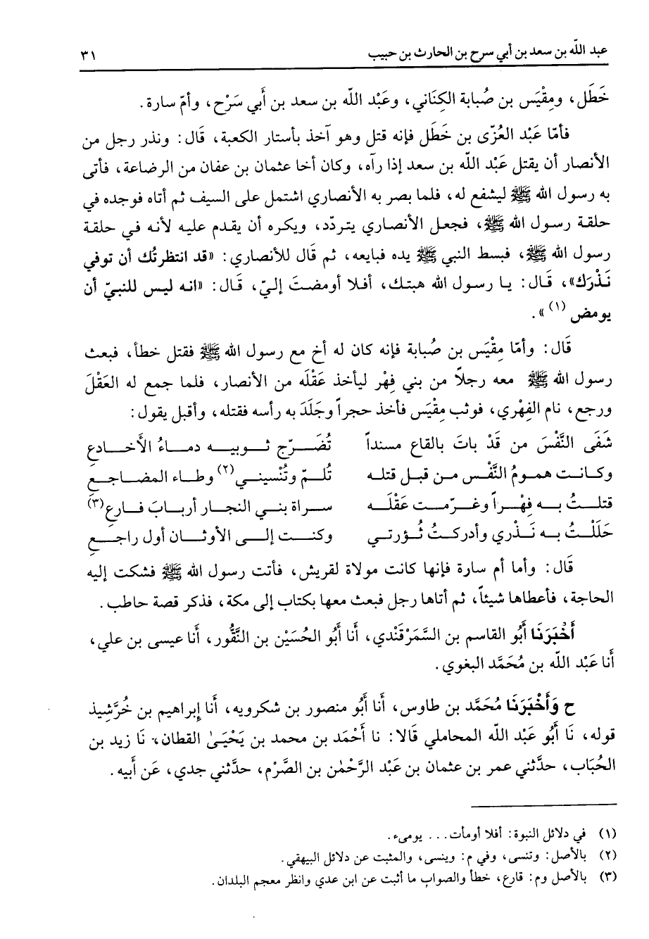 خطل ومقيس بن صبابة الكناني وعبد الله بن سعد بن أبي سرح وأم سارة فأما عبد العزى بن خطل فإنه قتل وهو آخذ بأستار الكعبة قال ونذر رجل من الأنصار أن يقتل عبد الله بن سعد إذا رآه وكان أخا عثمان بن عفان من الرضاعة فأتى به رسول الله (صلى الله عليه وسلم) ليشفع له فلما بصر به الأنصاري اشتمل على السيف ثم أتاه فوجده في حلقة رسول الله (صلى الله عليه وسلم) فجعل الأنصاري يتردد ويكره أن يقدم عليه لأنه في حلقة رسول الله (صلى الله عليه وسلم) فبسط النبي (صلى الله عليه وسلم) يده فبايعه ثم قال للأنصاري قد انتظرتك أن توفي نذرك قال يا رسول الله هبتك أفلا أومضت إلي قال إنه ليس للنبي أن يومض (1) قال وأما مقيس بن صبابة فإنه كان له أخ مع رسول الله (صلى الله عليه وسلم) فقتل خطأ فبعث رسول الله (صلى الله عليه وسلم) معه رجلا من بني فهر ليأخذ عقله من الأنصار فلما جمع له العقل ورجع نام الفهري فوثب مقيس فأخذ حجرا وجلد به رأسه فقتله وأقبل يقول * شفى النفس من قد بات بالقاع مسندا * تضرج ثوبيه دماء الأخادع وكانت هموم النفس من قبل قتله * تلم وتنسيني (2) وطاء المضاجع قتلت به فهرا وغرمت عقله * سراة بني النجار أرباب فارع (3) حللت به نذري وأدركت ثؤرتي * وكنت إلى الأوثان أول راجع * قال وأما أم سارة فإنها كانت مولاة لقريش فأتت رسول الله (صلى الله عليه وسلم) فشكت إليه الحاجة فأعطاها شيئا ثم أتاها رجل فبعث معها بكتاب إلى مكة فذكر قصة حاطب أخبرنا أبو القاسم بن السمرقندي أنا أبو الحسين بن النقور أنا عيسى بن علي أنا عبد الله بن محمد البغوي ح وأخبرنا محمد بن طاوس أنا أبو منصور بن شكرويه أنا إبراهيم بن خرشيذ قوله نا أبو عبد الله المحاملي قالا نا أحمد بن محمد بن يحيى القطان نا زيد بن الحباب حدثني عمر بن عثمان بن عبد الرحمن بن الصرم حدثني جدي عن أبيه
