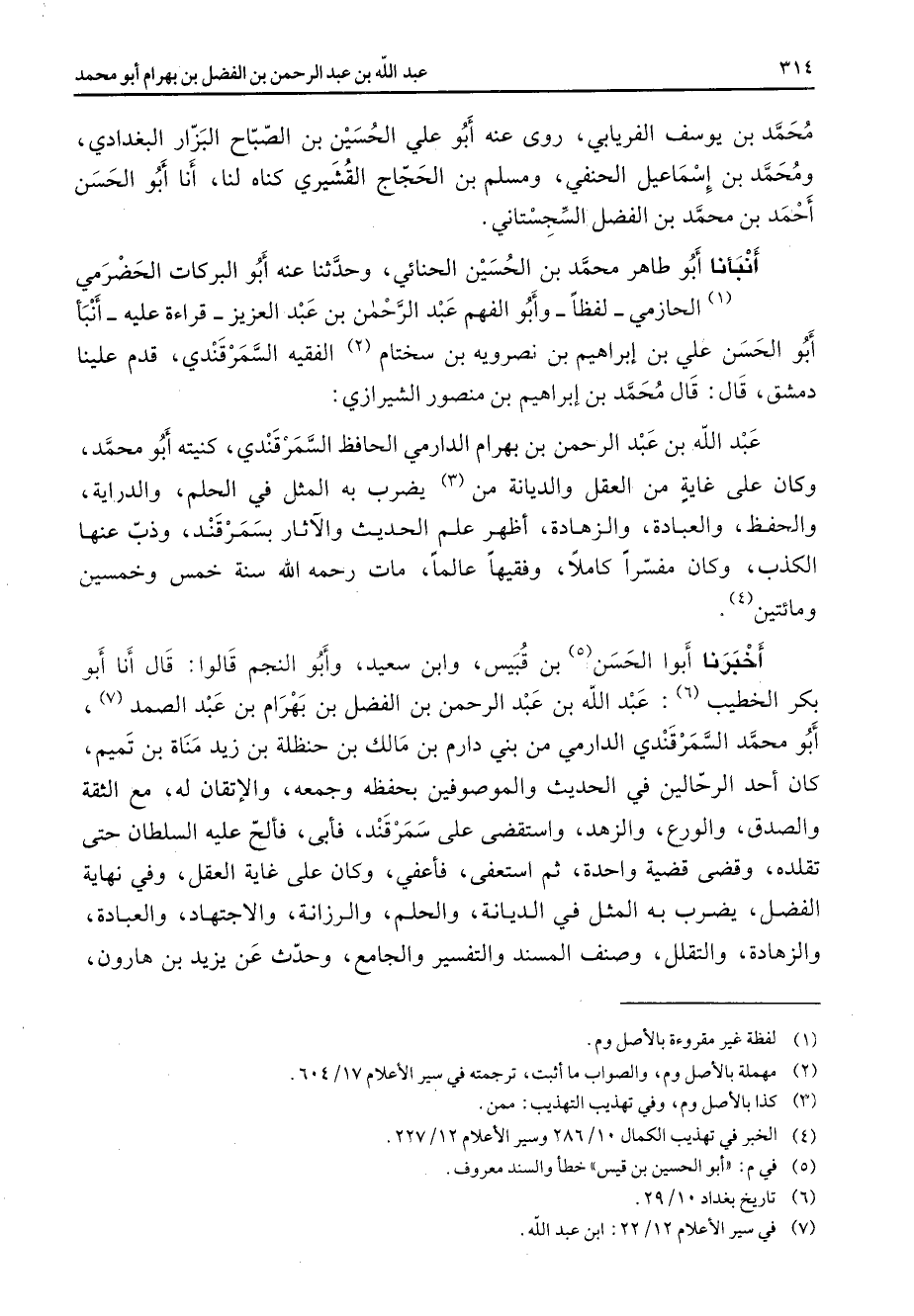 (1) الحازمي لفظا وأبو الفهم عبد الرحمن بن عبد العزيز قراءة عليه أنبأ أبو الحسن علي بن إبراهيم بن نصرويه بن سختام (2) الفقيه السمرقندي قدم علينا دمشق قال قال محمد بن إبراهيم بن منصور الشيرازي عبد الله بن عبد الرحمن بن بهرام الدارمي الحافظ السمرقندي كنيته أبو محمد وكان على غاية من العقل والديانة من (3) يضرب به المثل في الحلم والدراية والحفظ والعبادة والزهادة أظهر علم الحديث والآثار بسمرقند وذب عنها الكذب وكان مفسرا كاملا وفقيها عالما مات رحمه الله سنة خمس وخمسين ومائتين (4) أخبرنا أبو الحسن (5) بن قبيس وابن سعيد وأبو النجم قالوا قال أنا أبو بكر الخطيب (6) عبد الله بن عبد الحرمن بن الفضل بن بهرام بن عبد الصمد (7) أبو محمد السمرقندي الدارمي من بني دارم بن مالك بن حنظلة بن زيد مناة بن تميم كان أحد الرحالين في الحديث والموصوفين بحفظه وجمعه والإتقان له مع الثقة والصدق والورع والزهد واستقضى على سمرقند فأبي فألح عليه السلطان حتى تقلده وقضى قضية واحدة ثم استعفى فأعفي وكان على غاية العقل وفي نهاية الفضل يضرب به المثل في الديانة والحلم والرزانة والاجتهاد والعبادة والزهادة والتقلل وصنف المسند والتفسير والجامع وحدث عن يزيد بن هارون