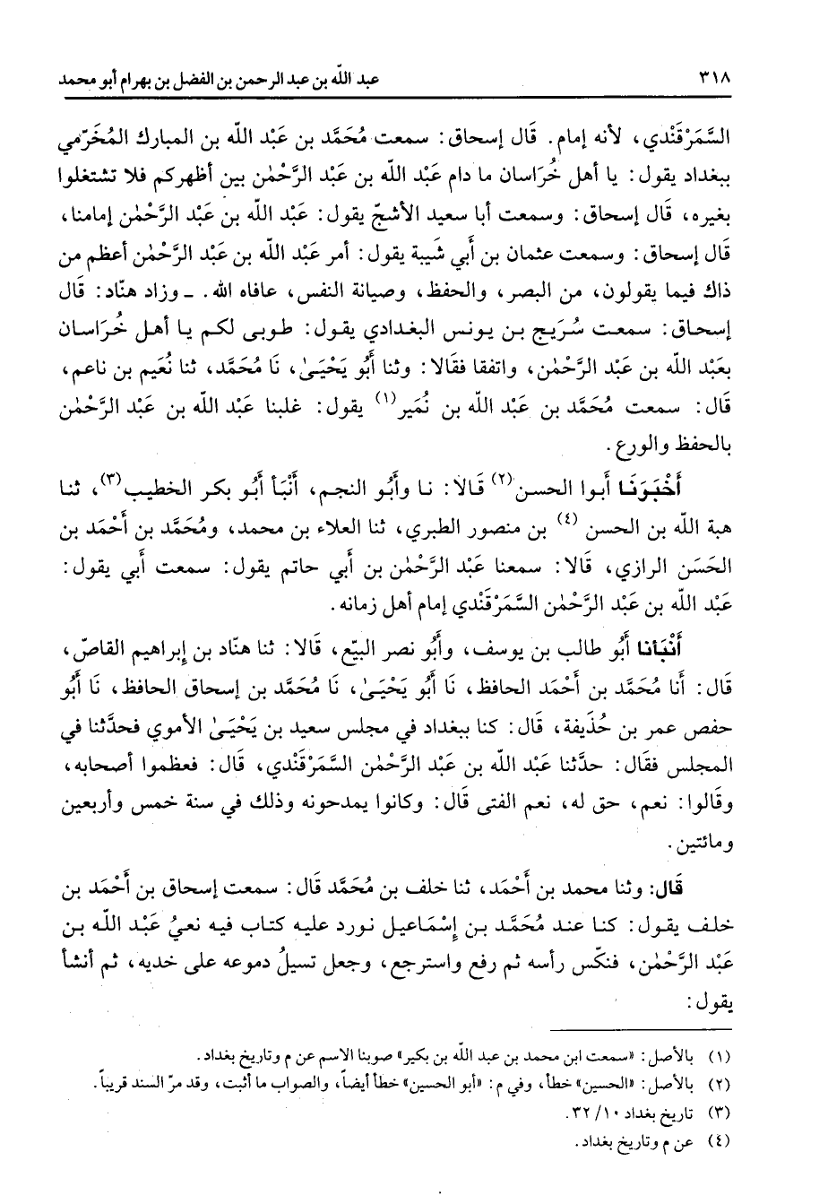 السمرقندي لأنه إمام قال إسحاق سمعت محمد بن عبد الله بن المبارك المخرمي ببغداد يقول يا أهل خراسان ما دام عبد الله بن عبد الرحمن بين أظهركم فلا تشتغلوا بغيره قال إسحاق وسمعت أبا سعيد الأشج يقول عبد الله بن عبد الرحمن إمامنا قال إسحاق وسمعت عثمان بن أبي شيبة يقول أمر عبد الله بن عبد الرحمن أعظم من ذاك فيما يقولون من البصر والحفظ وصيانة النفس عافاه الله وزاد هناد قال إسحاق سمعت سريج بن يونس البغدادي يقول طوبى لكم يا أهل خراسان بعبد الله بن عبد الرحمن واتفقا فقالا وثنا أبو يحيى نا محمد ثنا نعيم بن ناعم قال سمعت محمد بن عبد الله بن نمير (1) يقول غلبنا عبد الله بن عبد الرحمن بالحفظ والورع أخبرنا أبوا الحسن (2) قالا نا وأبو النجم أنبأ أبو بكر الخطيب (3) ثنا هبة الله بن الحسن (4) بن منصور الطبري ثنا العلاء بن محمد ومحمد بن أحمد بن الحسن الرازي قالا سمعنا عبد الرحمن بن أبي حاتم يقول سمعت أبي يقول عبد الله بن عبد الرحمن السمرقندي إمام أهل زمانه أنبأنا أبو طالب بن يوسف وأبو نصر البيع قالا ثنا هناد بن إبراهيم القاص قال أنا محمد بن أحمد الحافظ نا أبو يحيى نا محمد بن إسحاق الحافظ نا أبو حفص عمر بن حذيفة قال كنا ببغداد في مجلس سعيد بن يحيى الأموي فحدثنا في المجلس فقال حدثنا عبد الله بن عبد الرحمن السمرقندي قال فعظموا أصحابه
