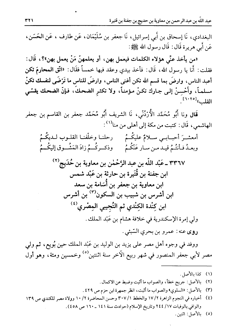 3367 - عبد الله بن عبد الرحمن بن معاوية بن حديج (2) ابن جفنة بن قتيرة بن حارثة بن عبد شمس بن معاوية بن جعفر بن أسامة بن سعد بن أشرس بن شبيب بن السكون (3) بن أشرس بن كندة الكندي ثم التجيبي المصري (4) ولي إمرة الإسكندرية في خلافة هشام بن عبد الملك روى عنه عمرو بن بحري السبئي ووفد في وجوه أهل مصر على يزيد بن الوليد بن عبد الملك حين بويع ثم ولي مصر لأبي جعفر المنصور في شهر ربيع الآخر سنة اثنتين (5) وخمسين ومئة وهو أول