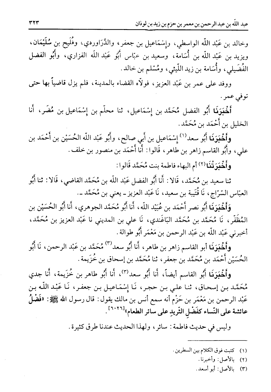 وخالد بن عبد الله الواسطي وإسماعيل بن جعفر والدراوردي وفليح بن سليمان ويزيد بن عبد الله بن أسامة وسعيد بن عباس أبو عبد الله الفزاري وأبو الفضل الفضيلي وأسامة بن زيد الليثي ومسلم بن خالد ووفد على عمر بن عبد العزيز فولاه القضاء بالمدينة فلم يزل قاضيا بها حتى توفي عمر أخبرنا أبو الفضل محمد بن إسماعيل ثنا محلم بن إسماعيل بن مضر أنا الخليل بن أحمد بن محمد وأخبرنا أبو سعد (1) إسماعيل بن أبي صالح وأبو عبد الله الحسين بن أحمد بن علي وأبو القاسم زاهر بن طاهر قالوا أنا أحمد بن منصور بن خلف وأخبرتنا (2) أم البهاء فاطمة بنت محمد قالوا ثنا سعيد بن محمد قالا أنا أبو الفضل عبد الله بن محمد القاضي قالا ثنا أبو العباس السراج نا قتيبة بن سعيد نا عبد العزيز يعني بن محمد وأخبرنا أبو نصر أحمد بن عبيد الله أنا أبو محمد الجوهري أنا أبو الحسين بن المظفر نا محمد بن محمد الباغندي نا علي بن المديني نا عبد العزيز بن محمد أخبرني عبد الله بن عبد الرحمن بن معمر أبو طوالة وأخبرنا أبو القاسم زاهر بن طاهر أنا أبو سعد (3) محمد بن عبد الرحمن نا أبو الحسين أحمد بن محمد بن جعفر ثنا محمد بن إسحاق بن خزيمة وأخبرنا أبو القاسم أيضا أنا أبو سعد (3) أنا أبو طاهر بن خزيمة أنا جدي محمد بن إسحاق ثنا علي بن حجر نا إسماعيل بن جعفر نا عبد الله بن عبد الرحمن بن معمر بن حزم أنه سمع أنس بن مالك يقول قال رسول الله (صلى الله عليه وسلم) فضل عائشة على النساء كفضل الثريد على سائر الطعام