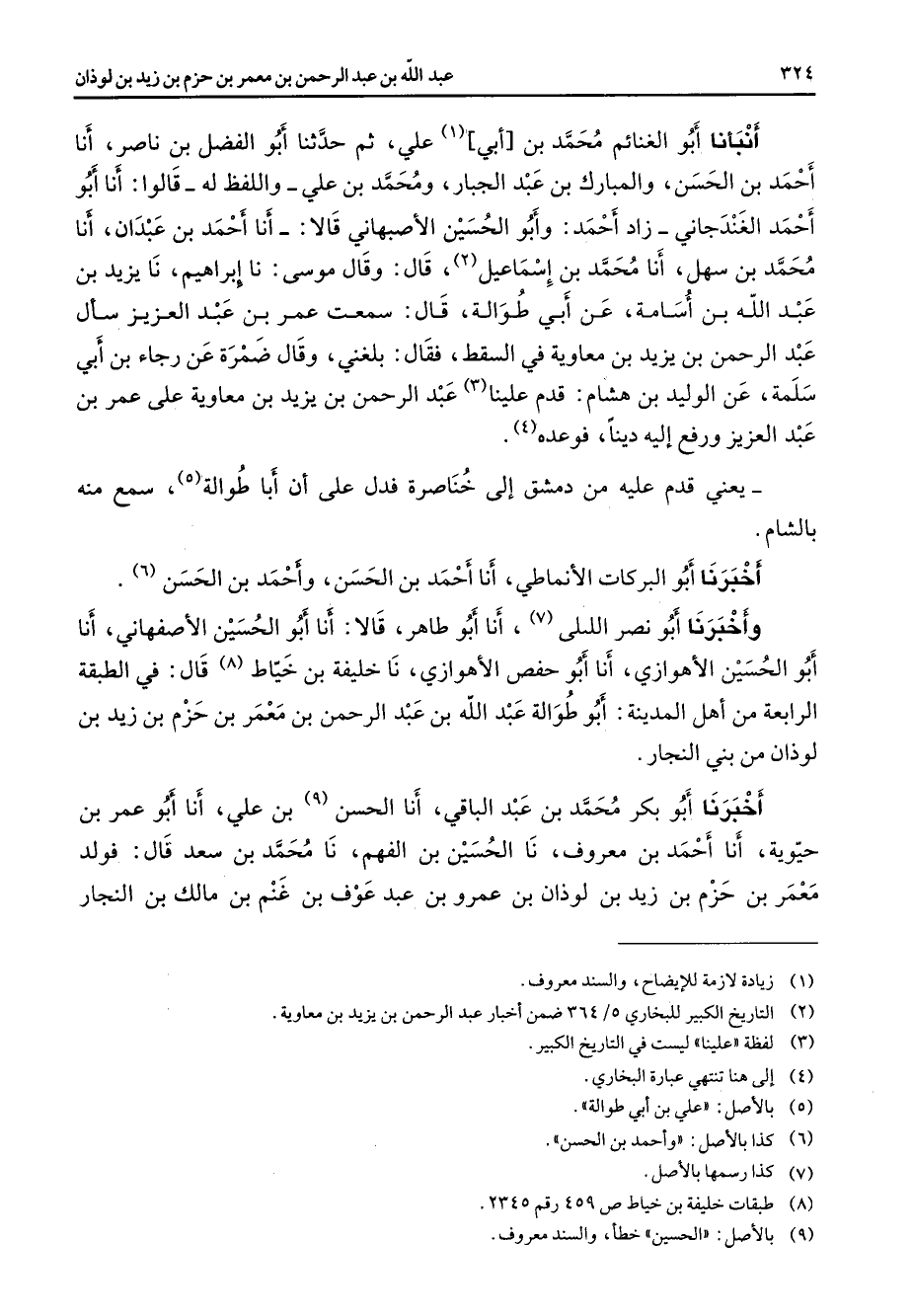 أنبأنا أبو الغنائم محمد بن أبي (1) علي ثم حدثنا أبو الفضل بن ناصر أنا أحمد بن الحسن والمبارك بن عبد الجبار ومحمد بن علي واللفظ له قالوا أنا أبو أحمد الغندجاني زاد أحمد وأبو الحسين الأصبهاني قالا أنا أحمد بن عبدان أنا محمد بن سهل أنا محمد بن إسماعيل (2) قال وقال موسى نا إبراهيم نا يزيد بن عبد الله بن أسامة عن أبي طوالة قال سمعت عمر بن عبد العزيز سأل عبد الرحمن بن يزيد بن معاوية في السقط فقال بلغني وقال ضمرة عن رجاء بن أبي سلمة عن الوليد بن هشام قدم علينا (3) عبد الرحمن بن يزيد بن معاوية على عمر بن عبد العزيز ورفع إليه دينا فوعده (4) يعني قدم عليه من دمشق إلى خناصرة فدل على أن أبا طوالة (5) سمع منه بالشام أخبرنا أبو البركات الأنماطي أنا أحمد بن الحسن وأحمد بن الحسن (6) وأخبرنا أبو نصر الليلي (7) أنا أبو طاهر قالا أنا أبو الحسين الأصفهاني أنا أبو الحسين الأهوازي أنا أبو حفص الأهوازي نا خليفة بن خياط (8) قال في الطبقة الرابعة من أهل المدينة أبو طوالة عبد الله بن عبد الرحمن بن معمر بن حزم بن حزم بن زيد بن لوذان من بني النجار أخبرنا أبو بكر محمد بن عبد الباقي أنا الحسن (9) بن علي أنا أبو عمر بن حيوية أنا أحمد بن معروف نا الحسين بن الفهم نا محمد بن سعد قال فولد معمر بن حزم بن زيد بن لوذان بن عمرو بن عبد عوف بن غنم بن مالك بن النجار