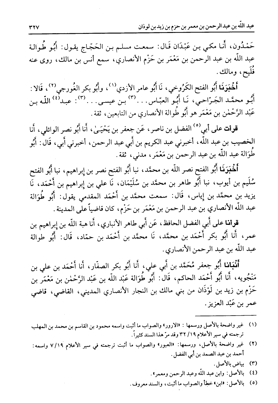 (3) عبد (4) الله بن عبد الرحمن بن معمر هو أبو طوالة الأنصاري من التابعين ثقة قرأت على أبي (5) الفضل بن ناصر عن جعفر بن يحيى أنا أبو نصر الوائلي أنا الخصيب بن عبد الله أخبرني عبد الكريم بن أبي عبد الرحمن أخبرني أبي قال أبو طوالة عبد الله بن عبد الرحمن بن معمر مدني ثقة أخبرنا أبو الفتح نصر الله بن محمد نبا أبو الفتح نصر بن إبراهيم نبا أبو الفتح سليم بن أيوب نبا أبو طاهر بن محمد بن سليمان نا علي بن إبراهيم بن أحمد نا يزيد بن محمد بن إياس قال سمعت محمد بن أحمد المقدمي يقول أبو طوالة عبد الله الأنصاري بن عبد الرحمن بن معمر بن حزم كان قاضيا على المدينة قرأنا على أبي الفضل الحافظ عن أبي طاهر الأنباري أنا هبة الله بن إبراهيم بن عمر أنا أبو بكر أحمد بن محمد نا محمد بن أحمد بن حماد قال أبو طوالة عبد الله بن عبد الرحمن الأنصاري أنبأنا أبو جعفر محمد بن أبي علي أنا أبو بكر الصفار أنا أحمد بن علي بن منجويه أنا أبو أحمد الحاكم قال أبو طوالة عبد الله بن عبد الرحمن بن معمر بن حزم بن زيد بن لوذان من بني مالك بن النجار الأنصاري المديني القاضي قاضي عمر بن عبد العزيز