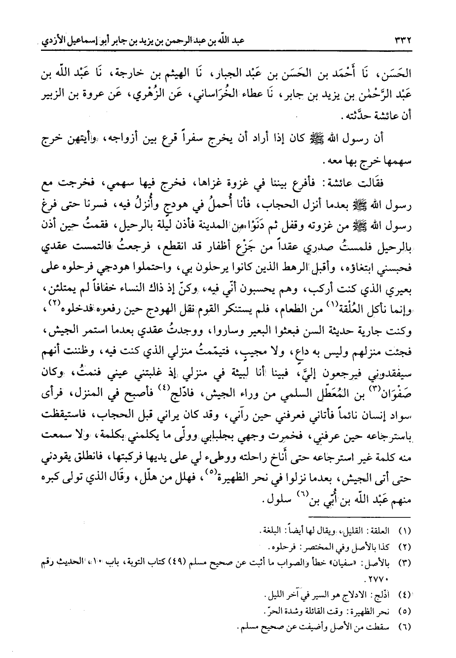 الحسن نا أحمد بن الحسن بن عبد الجبار نا الهيثم بن خارجة نا عبد الله بن عبد الرحمن بن يزيد بن جابر نا عطاء الخراساني عن الزهري عن عروة بن الزبير أن عائشة حدثته أن رسول الله (صلى الله عليه وسلم) كان إذا أراد أن يخرج سفرا قرع بين أزواجه وأيتهن خرج سهمها خرج بها معه فقالت عائشة فأفرع بيننا في غزوة غزاها فخرج فيها سهمي فخرجت مع رسول الله (صلى الله عليه وسلم) بعدما أنزل الحجاب فأنا أحمل في هودج وأنزل فيه فسرنا حتى فرغ رسول الله (صلى الله عليه وسلم) من غزوته وقفل ثم دنوا من المدينة فأذن ليلة بالرحيل فقمت حين أذن بالرحيل فلمست صدري عقدا من جزع أظفار قد انقطع فرجعت فالتمست عقدي فحبسني ابتغاؤه وأقبل الرهط الذين كانوا يرحلون بي واحتملوا هودجي فرحلوه على بعيري الذي كنت أركب وهم يحسبون أني فيه وكن إذ ذاك النساء خفافا لم يمتلئن وإنما نأكل العلقة (1) من الطعام فلم يستنكر القوم نقل الهودج حين رفعوه فدخلوه (2) وكنت جارية حديثة السن فيعثوا البعير وساروا ووجدت عقدي بعدما استمر الجيش فجئت منزلهم وليس به داع ولا مجيب فتيممت منزلي الذي كنت فيه وظننت أنهم سيفقدوني فيرجعون إلي فبينا أنا لبيثة في منزلي إذ غلبتني عيني فنمت وكان صفوان (3) بن المعطل السلمي من وراء الجيش فادلج (4) فأصبح في المنزل فرأى سواد إنسان نائما فأتاني فعرفني حين رآني وقد كان يراني قبل الحجاب فاستيقظت باسترجاعه حين عرفني فخمرت وجهي بجلبابي وولى ما يكلمني بكلمة ولا سمعت منه كلمة غير استرجاعه حتى أناخ راحلته ووطئ لي على يديها فركبتها فانطلق يقودني حتى أتى الجيش بعدما نزلوا في نحر الظهيرة (5) فهلل من هلل وقال الذي تولى كبره منهم عبد الله بن أبي بن (6) سلول