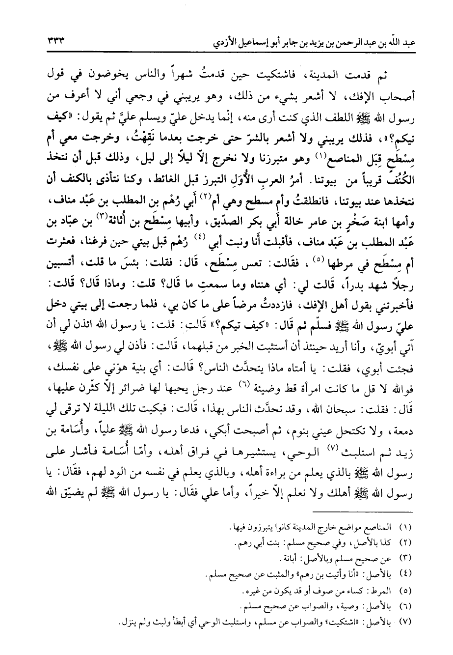ثم قدمت المدينة فاشتكيت حين قدمت شهرا والناس يخوضون في قول أصحاب الإفك لا أشعر بشئ من ذلك وهو يريبني في وجعي أني لا أعرف من رسول الله (صلى الله عليه وسلم) اللطف الذي كنت أرى منه إنما يدخل علي ويسلم علي ثم يقول كيف تيكم فذلك يريبني ولا أشعر بالشر حتى خرجت بعدما نقهت وخرجت معي ام مسطح قبل المناصع (1) وهو متبرزنا ولا نخرج إلا ليلا إلى ليل وذلك قبل أنا نتخذ الكنف قريبا من بيوتنا أمر العرب الأول التبرز قبل الغائظ وكنا نتأذى بالكنف أن نتخذها عند بيوتنا فانطلقت وأم مسطح وهي أم (2) أبي رهم بن المطلب بن عبد مناف وأمها ابنة صخر بن عامر خالة أبي بكر الصديق وأبيها مسطح بن أثاثة (3) بن عباد بن عبد المطلب بن عبد مناف فأقبلت أنا ونبت أبي (4) رهم قبل بيتي حين فرغنا فعثرت أم مسطح في مرطها (5) فقالت تعس مسطح قال فقلت بئس ما قلت أتسبين رجلا شهد بدرا قالت لي أي هنتاه وما سمعت ما قال قلت وماذا قال قالت فأخبرتني بقول أهل الإفك فازددت مرضا على ما كان بي فلما رجعت إلى بيتي دخل علي رسول الله (صلى الله عليه وسلم) فسلم ثم قال كيف تيكم قالت قلت يا رسول الله ائذن لي أن آتي أبوي وانا أريد حينئذ أن أستثبت الخبر من قبلهما قالت فأذن لي رسول الله (صلى الله عليه وسلم) فجئت أبوي فقلت يا أمتاه ماذا يتحدث الناس قالت أي بنية هوني على نفسك فوالله لا قل ما كانت امرأة قط وضيئة (6) عند رجل يحبها لها ضرائر إلا كثرن عليها قال فقلت سبحان الله وقد تحدث الناس بهذا قالت فبكيت تلك الليلة لا ترقى لي دمعة ولا تكتحل عيني بنوم ثم أصبحت أبكي فدعا رسول الله (صلى الله عليه وسلم) عليا وأسامة زيد ثم استلبث (7) الوحي يستشيرها في فراق أهله وأما أسامة فأشار على رسول الله (صلى الله عليه وسلم) بالذي يعلم من براءة أهله وبالذي يعلم في نفسه من الود لهم فقال يا رسول الله (صلى الله عليه وسلم) أهلك ولا نعلم إلا خيرا واما علي فقال يا رسول الله (صلى الله عليه وسلم) لم يضيق الله