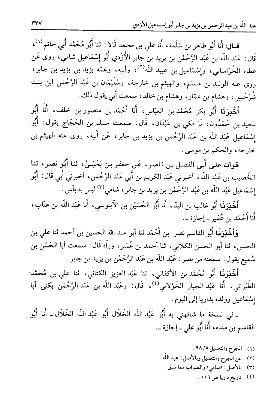 قرأت على أبي الفضل بن ناصر عن جعفر بن يحيى ثنا أبو نصر ثنا الخصيب بن عبد الله أخبرني عبد الكريم بن أبي عبد الرحمن أخبرني أبي قال أبو إسماعيل عبد الله بن عبد الرحمن بن يزيد بن جابر شامي (3) ليس به بأس أخبرنا أبو غالب بن البنا أنا أبو الحسين بن الآبنوسي أنا عبد الله بن عتاب أنا أحمد بن عمير إجازة وأخبرنا أبو القاسم نصر بن أحمد ثنا أبو عبد الله الحسين بن أحمد ثنا علي بن الحسن ثنا أبو الحسن الكلابي ثنا أحمد بن عمير ورآه قال سمعت أبا الحسن بن سميع يقول سمعته من نصر عبد الله بن عبد الرحمن بن يزيد بن جابر أخبرنا أبو محمد بن الأكفاني ثنا عبد العزيز الكتاني ثنا علي بن محمد الطبراني أنا عبد الجبار الخولاني (4) قال وعبد الله بن عبد الرحمن يكنى أبا إسماعيل وولده بداريا إلى اليوم في نسخة ما شافهني به أبو عبد الله الخلال أبو عبد الله الخلال أنا أبو القاسم بن مندة أنا أبو علي إجازة