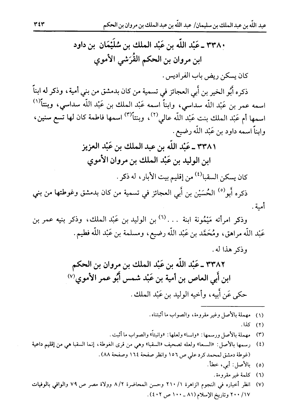 3381 - عبد الله بن عبد الملك بن عبد العزيز ابن الوليد بن عبد الملك بن مروان الأموي كان يسكن السقبا (4) من إقليم بيت الأبار له ذكر ذكره (5) أبو الحسين بن أبي العجائز في تسمية من كان بدمشق وغوطتها من بني أمية وذكر امرأته ميمونة ابنة