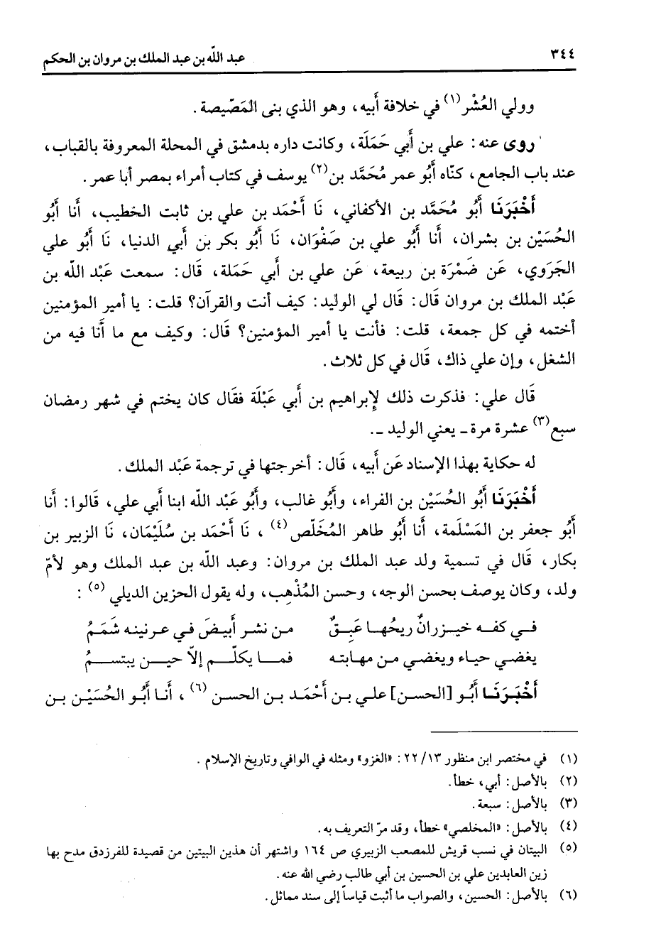 وولي العرش (1) في خلافة أبيه وهو الذي بنى المصيصة روى عنه علي بن أبي حملة وكانت داره بدمشق في المحلة المعروفة بالقباب عند باب الجامع كناه أبو عمر محمد بن (2) يوسف في كتاب أمراء بمصر أبا عمر أخبرنا أبو محمد بن الأكفاني نا أحمد بن علي بن ثابت الخطيب أنا أبو الحسين بن بشران أنا أبو علي بن صفوان نا أبو بكر بن أبي الدنيا نا أبو علي الجروي عن ضمرة بن ربيعة عن علي بن أبي حملة قال سمعت عبد الله بن عبد الملك بن مروان قال قال لي الوليد كيف أنت والقرآن قلت يا أمير المؤمنين أختمه في كل جمعة قلت فأنت يا أمير المؤمنين قال وكيف مع ما أنا فيه من الشغل وإن علي ذاك قال في كل ثلاث قال علي فذكرت ذلك لإبراهيم بن أبي عبلة فقال كان يختم في شهر رمضان سبع (3) عشرة مرة يعني الوليد له حكاية بهذا الإسناد عن أبيه قال أخرجتها في ترجمة عبد الملك أخبرنا أبو الحسين بن الفراء وأبو غالب وأبو عبد الله ابنا أبي علي قالوا أنا أبو جعفر بن المسلمة أنا أبو طاهر المخلص (4) نا أحمد بن سليمان نا الزبير بن بكار قال في تسمية ولد عبد الملك بن مروان وعبد الله بن عبد الملك وهو لأم ولد وكان يوصف بحسن الوجه وحسن المذهب وله يقول الحزين الديلي (5) * في كفه خيزران ريحها عبق * من نشر أبيض في عرنينه شمم يفضي حياء ويغضي من مهابته * فما يكلم إلا حين يبتسم * أخبرنا أبو الحسن علي بن أحمد بن الحسن (6) أنا أبو الحسين بن