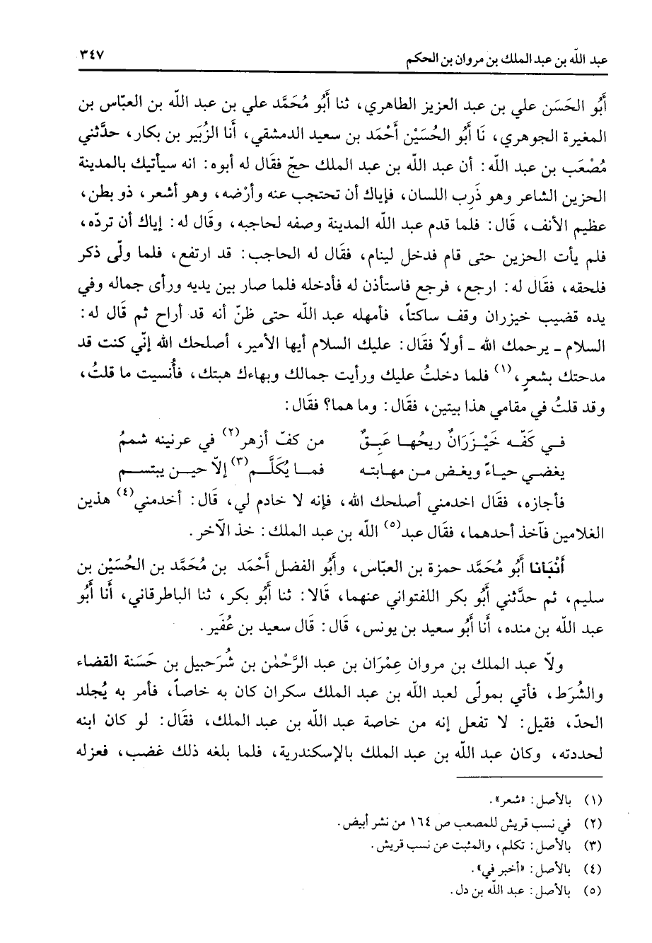 أبو الحسن علي بن عبد العزيز الطاهري ثنا أبو محمد علي بن عبد الله بن العباس بن المغيرة الجوهري نا أبو الحسين أحمد بن سعيد الدمشقي أنا الزبير بن بكار حدثني مصعب بن عبد الله أن عبد الله بن عبد الملك حج فقال له أبوه أنه سيأتيك بالمدينة الحزين الشاعر وهو ذرب اللسان فإياك أن تحتجب عنه وأرضه وهو أشعر ذو بطن عظيم الأنف قال فلما قدم عبد الله المدينة وصفه لحاجبه وقال له إياك أن ترده فلم يأت الحزين حتى قام فدخل لينام فقال له الحاجب قد ارتفع فلما ولى ذكر فلحقه فقال له ارجع فرجع فاستأذن له فأدخله فلما صار بين يديه ورأى جماله وفي يده قضيب خيزران وقف ساكتا فأمهله عبد الله حتى ظن أنه قد أراح ثم قال له السلام يرحمك الله أولا فقال عليك السلام أيها الأمير أصلحك الله إني كنت قد مدحتك بشعر (1) فلما دخلت عليك ورأيت جمالك وبهاءك هبتك فأنسيت ما قلت وقد قلت في مقامي هذا بيتين فقال وما هما فقال * في كفه خيزران ريحها عبق * من كف أزهر (2) في عرنينه شمم يغضي حياء ويغض من مهابته * فما يكلم (3) إلا حين يبتسم * فأجازه فقال اخدمني (5) أصلحك الله فإنه لا خادم لي قال أخدمي هذين الغلامين فآخذ أحدهما فقال عبد (5) الله بن عبد الملك خذ الآخر أنبأنا أبو محمد حمزة بن العباس وأبو الفضل أحمد بن محمد بن الحسين بن سليم ثم حدثني أبو بكر اللفتواني عنهما قالا ثنا أبو بكر ثنا الباطرقاني أنا أبو عبد الله بن مندة أنا أبو سعيد بن يونس قال قال سعيد بن عفير ولا عبد الملك بن مروان عمران بن عبد الرحمن بن شرحبيل بن حسنة القضاء والشرط فأتي بمولى لعبد الله بن عبد الملك سكران كان به خاصا فأمر به يجلد الحد فقيل لا تفعل إنه من خاصة عبد الله بن عبد الملك فقال لو كان ابنه لحددته وكان عبد الله بن عبد الملك بالإسكندرية فلما بلغه ذلك غضب فعزله