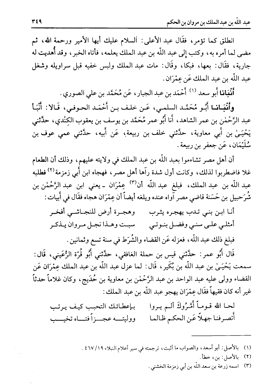 انطلق كما تؤمر فقال عبد الأعلى السلام عليك أيها الأمير ورحمة الله ثم مضى لما أمره به وكتب إلى عبد الله بن عبد الملك يعلمه فأتاه الخبر وقد أهديت له جارية فقال بعها فبكا وقال مات عبد الملك ولبس خفيه قبل سراويله وشغل عبد الله بن عبد الملك عن عمران أنبأنا أبو سعد (1) أحمد بن عبد الجبار عن محمد بن علي الصوري وأنبأنا أبو محمد السلمي عن خلف بن أحمد الحوفي قالا أنبأ عبد الرحمن بن عمر الشاهد أنا أبو عمر محمد بن يوسف بن يعقوب الكندي حدثني يحيى بن أبي معاوية حدثني خلف بن ربيعة عن أبيه حدثني عمي عوف بن سليمان عن جعفر بن ربيعة أن أهل مصر تشاءموا بعبد الله بن عبد الملك في ولايته عليهم وذلك أن الطعام غلا فاضطربوا لذلك وكانت أول شدة رآها أهل مصر فهجاه ابن أبي زمزمة (2) فطلبه عبد الله بن عبد الملك فبلغ عبد الله أن (3) عمران يعني ابن عبد الرحمن بن شرحبيل بن حسنة قاضي مصر آواه عنده وبلغه أيضا أن عمران هجاه فقال في أبيات * أنا ابن بني تدب يهجره يثرب * وهجرة أرض للنجاشي أفخر أمثلي على سني وفضل بنوتي * سبت وهذا نجل مروان يذكر * فبلغ ذلك عبد الله فعزله عن القضاء والشرط في سنة تسع وثمانين قال أبو عمر حدثني قيس بن حملة الغافقي حدثني أبو قرة الرعيني قال سمعت يحيى بن عبد الله بن بكير قال لما عزل عبد الله بن عبد الملك عمران عن القضاء وولى عليه عبد الواحد بن عبد الرحمن بن معاوية بن حديج وكان غلاما حدثا غير أنه كان فقيها فقال عمران يهجو عبد الله بن عبد الملك * لحا الله قوما أمروك ألم يروا * بإعطائك التحبب كيف يرتب أتصرفنا جهلا عن الحكم ظالما * ووليته عجزا فتاه تخيب