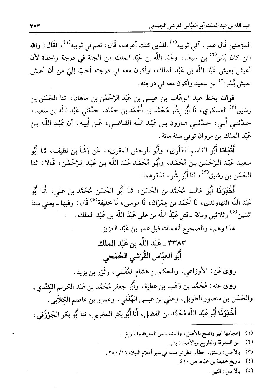 المؤمنين قال عمر أفي ثوبيه (1) اللذين كنت أعرف قال نعم في ثوبيه (1) فقال والله لئن كان بسر (2) بن سعيد وعبد الله بن عبد الملك من الجنة في درجة واحدة لأن أعيش بعيش عبد الله بن عبد الملك وأكون معه في درجته أحب إلي من أن أعيش بعيش بسر (2) بن سعيد وأكون معه في درجته قرأت بخط عبد الوهاب بن عيسى بن عبد الرحمن بن ماهان ثنا الحسن بن رشيق (3) العسكري نا أبو بشر محمد بن أحمد بن حماد حدثني عبد الله بن سعيد حدثني أبي حدثني هارون بن عبد الله القاضي عن أبيه أن عبد الله بن عبد الملك بن مروان توفي سنة مائة أنبأنا أبو القاسم العلوي وأبو الوحش المقرئ عن رشأ بن نظيف ثنا أبو سعيد عبد الرحمن بن محمد وأبو محمد بن عبد الله بن عبد الرحمن قالا ثنا الحسن بن رشيق (3) ثنا أبو بشر فذكرهما أخبرنا أبو غالب محمد بن الحسن ثنا أبو الحسن محمد بن علي أنا أبو عبد الله النهاوندي نا أحمد بن عمران نا موسى نا خليفة (4) قال وفيها يعني سنة اثنتين (5) وثلاثين ومائة قتل عبد الله بن علي عبد الله بن عبد الملك هذا وهم والصحيح أنه مات قبل عمر بن عبد العزيز