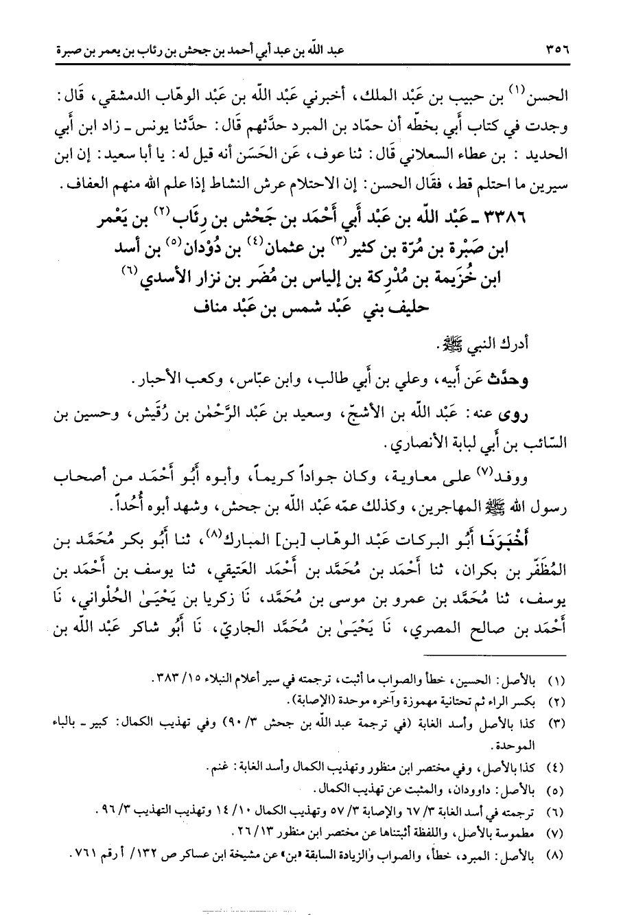3386 - عبد الله بن عبد أبي أحمد بن جحش بن رئاب (2) بن يعمر ابن صبرة بن مرة بن كثير (3) بن عثمان (4) بن دودان (5) بن أسد ابن خزيمة بن مدركة بن إلياس بن مضر بن نزار الأسدي (6) حليف بني عبد شمس بن عبد مناف أدرك النبي (صلى الله عليه وسلم) وحدث عن أبيه وعلي بن أبي طالب وابن عباس وكعب الأحبار روى عنه عبد الله بن الأشج وسعيد بن عبد الرحمن بن رقيش وحسين بن السائب بن أبي لبابة الأنصاري ووفد (7) على معاوية وكان جوادا كريما وأبوه أبو أحمد من أصحاب رسول الله (صلى الله عليه وسلم) المهاجرين وكذلك عمه عبد الله بن جحش وشهد أبوه أحدا أخبرنا أبو البركات عبد الوهاب بن المبارك (8) ثنا أبو بكر محمد بن المظفر بن بكران ثنا أحمد بن محمد بن أحمد العتيقي ثنا يوسف بن أحمد بن يوسف ثنا محمد بن عمرو بن موسى بن محمد نا زكريا بن يحيى الحلواني نا أحمد بن صالح المصري نا يحيى بن محمد الجاري نا أبو شاكر عبد الله بن
