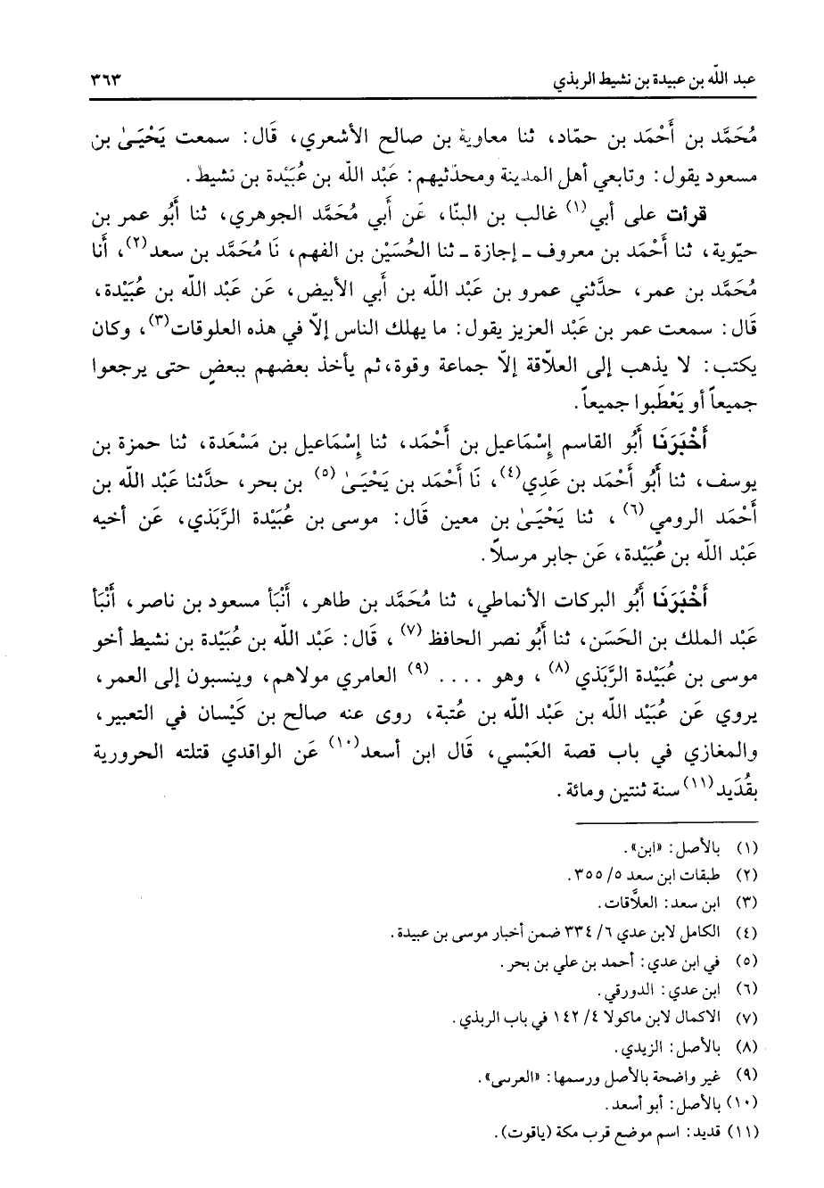 محمد بن أحمد بن حماد ثنا معاوية بن صالح الأشعري قال سمعت يحيى بن مسعود يقول وتابعي أهل المدينة ومحدثيهم عبد الله بن عبيدة بن نشيط قرأت على أبي (1) غالب بن البنا عن أبي محمد الجوهري ثنا أبو عمر بن حيوية ثنا أحمد بن معروف إجازة ثنا الحسين بن الفهم نا محمد بن سعد (2) أنا محمد بن عمر حدثني عمرو بن عبد الله بن أبي الأبيض عن عبد الله بن عبيدة قال سمعت عمر بن عبد العزيز يقول ما يهلك الناس إلا في هذه العلوقات (3) وكان يكتب لا يذهب إلى العلاقة إلا جماعة وقوة ثم يأخذ بعضهم ببعض حتى يرجعوا جميعا أو يعطبوا جميعا أخبرنا أبو القاسم إسماعيل بن أحمد ثنا إسماعيل بن مسعدة ثنا حمزة بن يوسف ثنا أبو أحمد بن عدي (4) نا أحمد بن يحيى (5) بن بحر حدثنا عبد الله بن أحمد الرومي (6) ثنا يحيى بن معين قال موسى بن عبيدة الربذي عن أخيه عبد الله بن عبيدة عن جابر مرسلا أخبرنا أبو البركات الأنماطي ثنا محمد بن طاهر أنبأ مسعود بن ناصر أنبأ عبد الملك بن الحسن ثنا أبو نصر الحافظ قال عبد الله بن عبيدة بن نشيط أخو موسى بن عبيدة الربذي (8) وهو