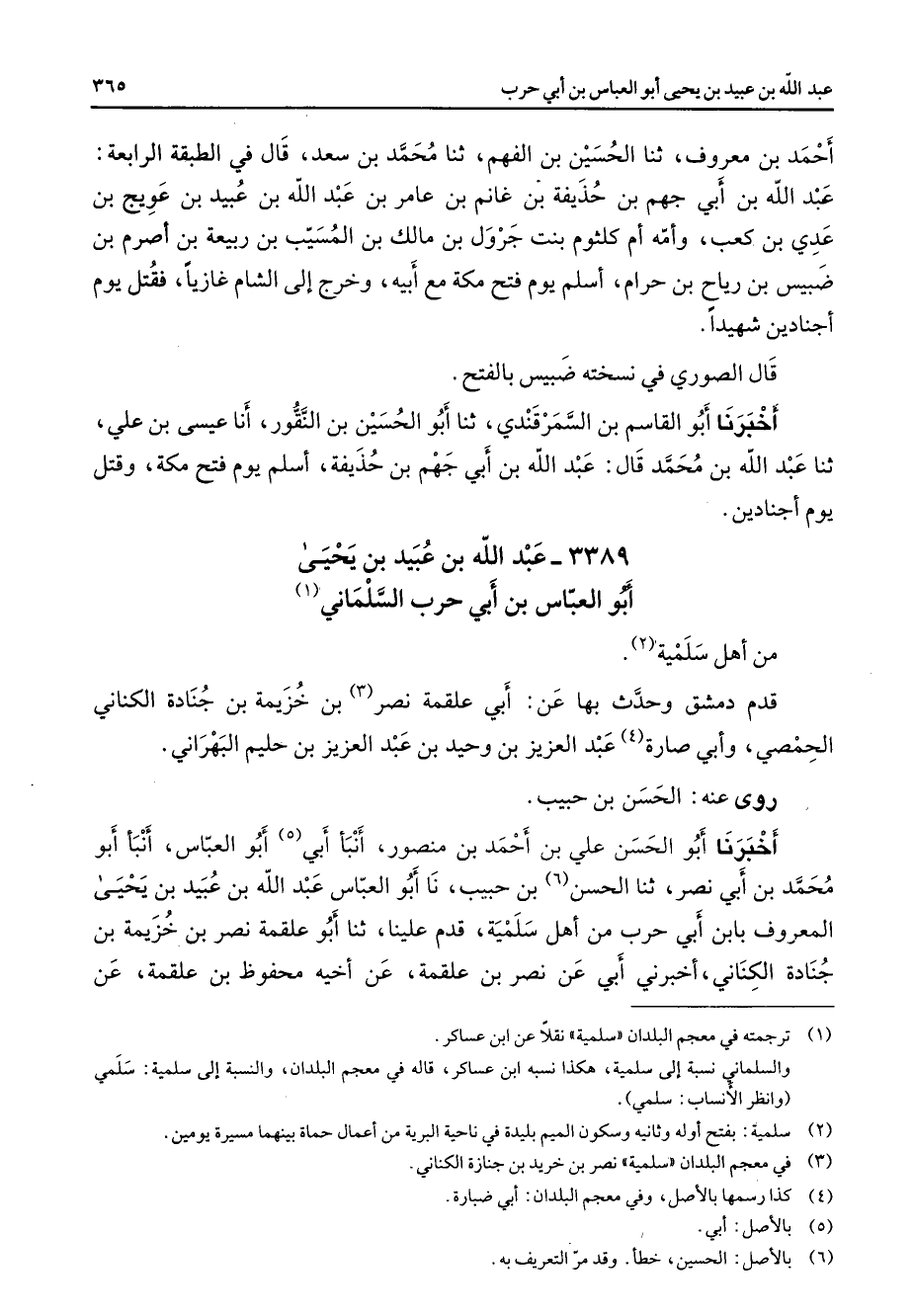 3389 - عبد الله بن عبيد بن يحيى أبو العباس بن أبي حرب السلماني (1) من أهل سلمية (2) قدم دمشق وحدث بها عن أبي علقمة نصر (3) بن خزيمة بن جنادة الكناني الحمصي وأبي صارة (4) عبد العزيز بن وحيد بن عبد العزيز بن حليم البهراني روى عنه الحسن بن حبيب أخبرنا أبو الحسن علي بن أحمد بن منصور أنبأ أبي (5) أبو العباس أنبأ أبو محمد بن أبي نصر ثنا الحسن (6) بن حبيب نا أبو العباس عبد الله بن عبيد بن يحيى المعروف بابن أبي حرب من أهل سلمية قدم علينا ثنا أبو علقمة نصر بن خزيمة بن جنادة الكناني أخبرني أبي عن نصر بن علقمة عن أخيه محفوظ بن علقمة عن