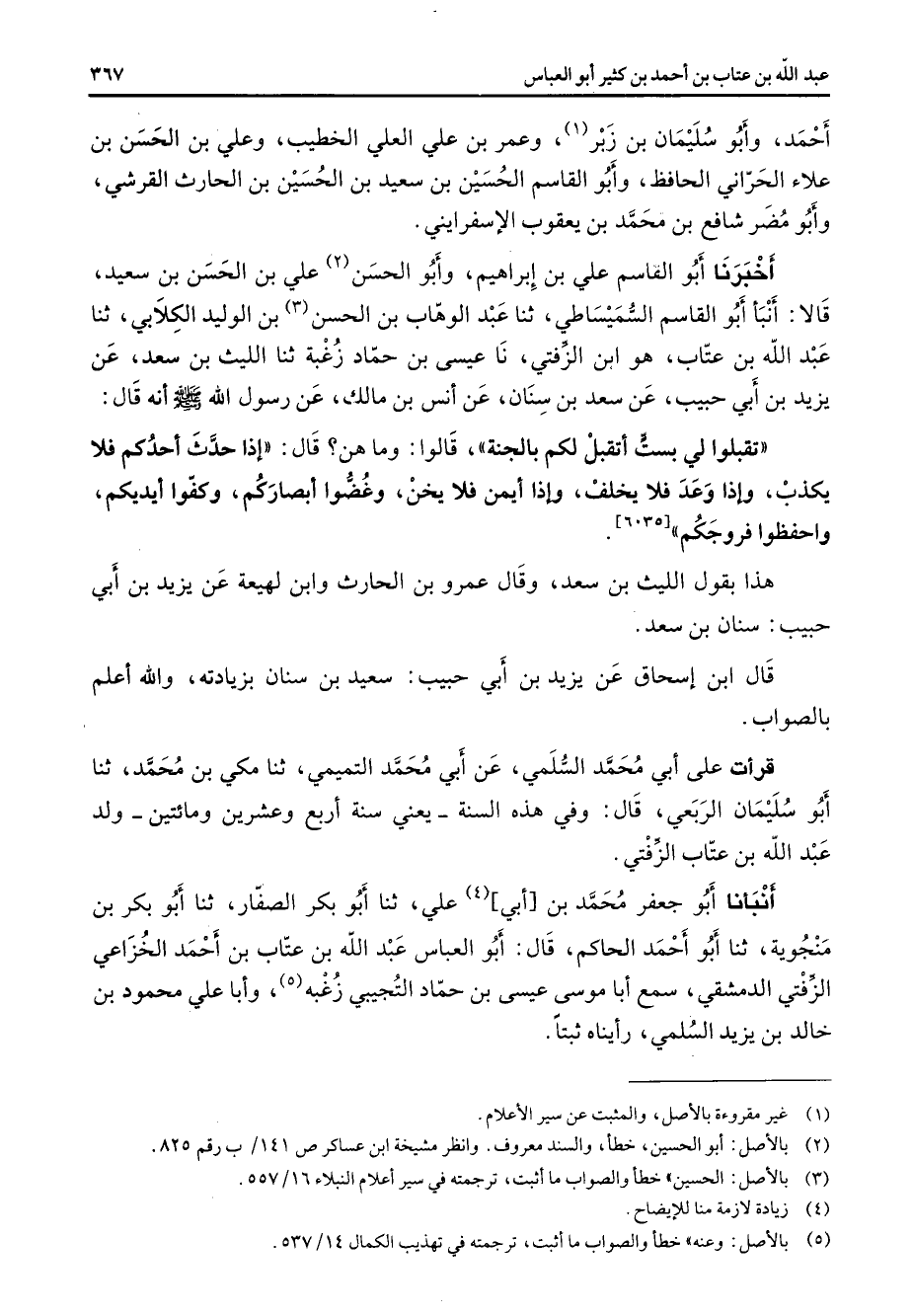 [6035] هذا بقول الليث بن سعد وقال عمرو بن الحارث وابن لهيعة عن يزيد بن أبي حبيب سنان بن سعد قال ابن إسحاق عن يزيد بن أبي حبيب سعيد بن سنان بزيادته والله أعلم بالصواب قرأت على أبي محمد السلمي عن أبي محمد التميمي ثنا مكي بن محمد ثنا أبو سليمان الربعي قال وفي هذه السنة يعني سنة أربع وعشرين ومائتين ولد عبد الله بن عتاب الزفتي أنبأنا أبو جعفر محمد بن أبي (4) علي ثنا أبو بكر الصفار ثنا أبو بكر بن منجوية ثنا أبو أحمد الحاكم قال أبو العباس عبد الله بن عتاب بن أحمد الخزاعي الزفتي الدمشقي سمع أبا موسى عيسى بن حماد التجيبي زغبة (5) وأبا علي محمود بن خالد بن يزيد السلمي رأيناه ثبتا