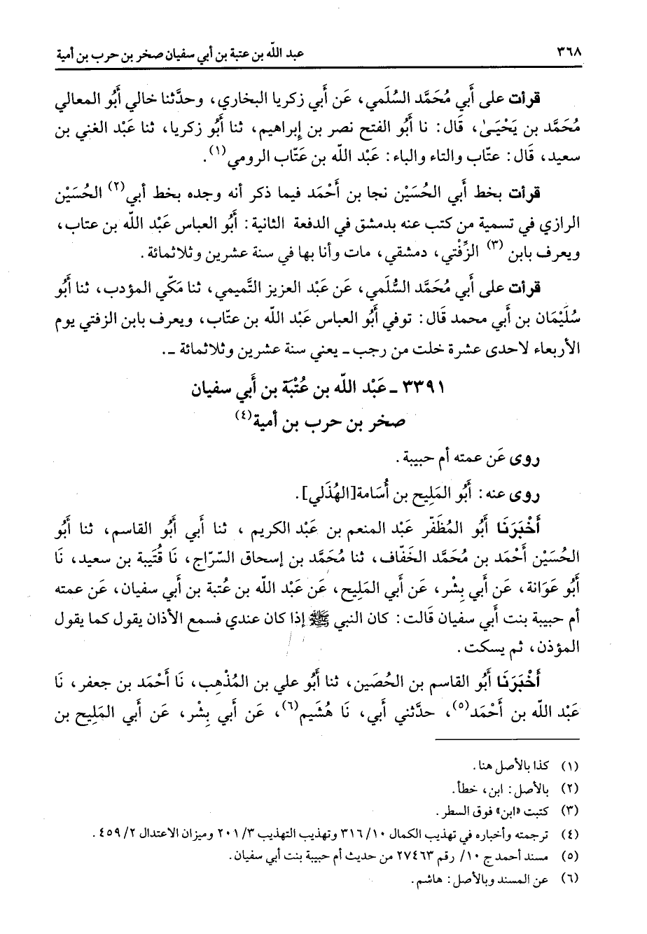 3391 - عبد الله بن عتبة بن أبي سفيان صخر بن حرب بن أمية (4) روى عن عمته أم حبيبة روى عنه أبو المليح بن أسامة الهذلي أخبرنا أبو المظفر عبد المنعم بن عبد الكريم ثنا أبي أبو القاسم ثنا أبو الحسين أحمد بن محمد الخفاف ثنا محمد بن إسحاق السراج نا قتيبة بن سعيد نا أبو عوانة عن أبي بشر عن أبي المليح عن عبد الله بن عتبة بن أبي سفيان عن عمته أم حبيبة بنت أبي سفيان قالت كان النبي (صلى الله عليه وسلم) إذا كان عندي فسمع الأذان يقول كما يقول المؤذن ثم يسكت أخبرنا أبو القاسم بن الحصين ثنا أبو علي بن المذهب نا أحمد بن جعفر نا عبد الله بن أحمد (5) حدثني أبي نا هشيم (6) عن أبي بشر عن أبي المليح بن