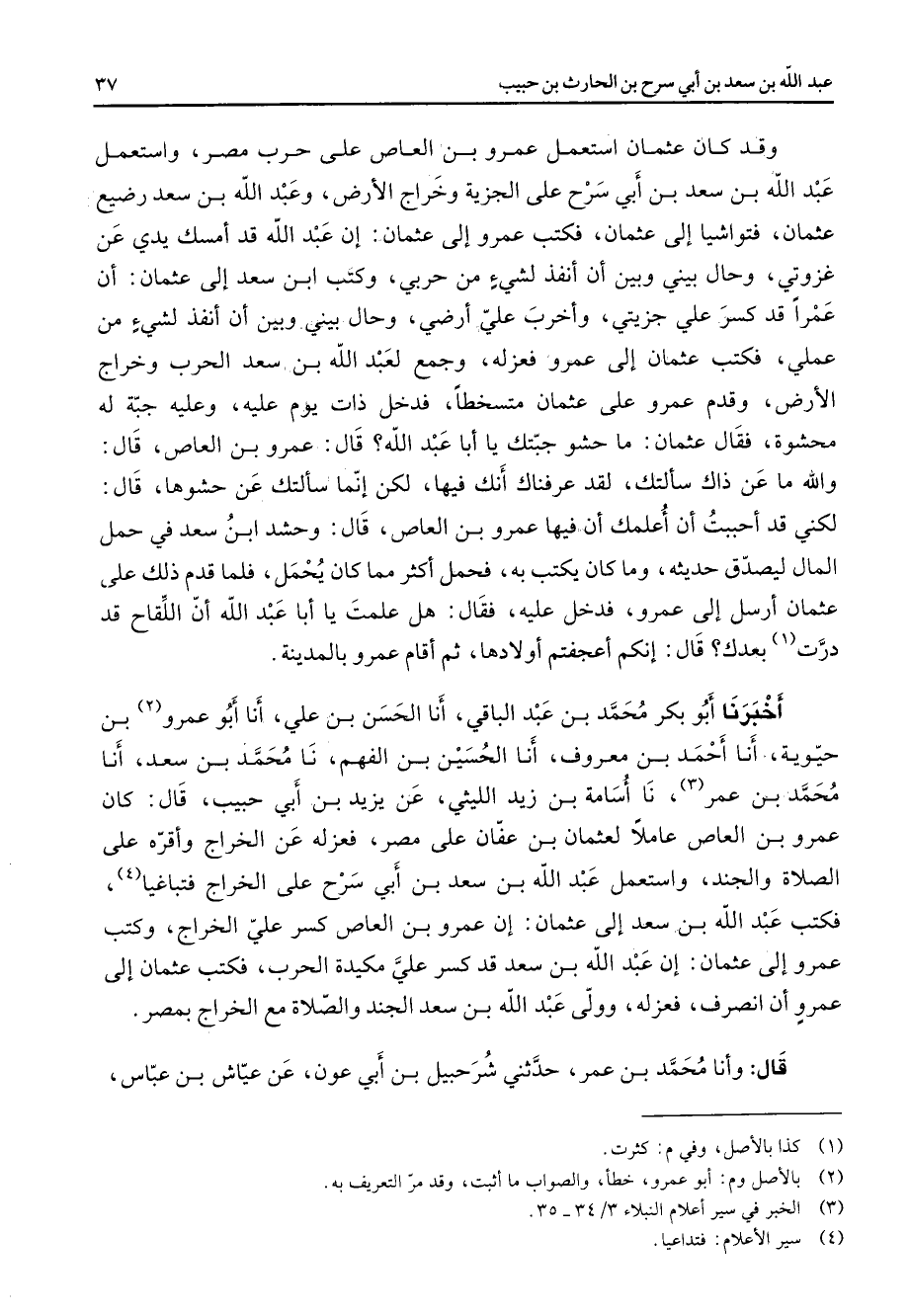 وقد كان عثمان استعمل عمرو بن العاص على حرب مصر واستعمل عبد الله بن سعد بن أبي سرح على الجزية وخراج الأرض وعبد الله بن سعد رضيع عثمان فتواشيا إلى عثمان فكتب عمرو إلى عثمان إن عبد الله قد أمسك يدي عن غزوتي وحال بيني وبين أن أنفذ لشئ من حربي وكتب ابن سعد إلى عثمان أن عمرا قد كسر علي جزيتي وأخرب علي أرضي وحال بيني وبين أن أنفذ لشئ من عملي فكتب عثمان إلى عمرو فعزله وجعل لعبد الله بن سعد الحرب وخراج الأرض وقدم عمرو على عثمان متسخطا فدخل ذات يوم عليه وعليه جبة له محشوة فقال عثمان ما حشو جبتك يا أبا عبد الله قال عمرو بن العاص قال والله ما عن ذاك سألتك لقد عرفناك أنك فيها لكن إنما سألتك عن حشوها قال لكني قد أحببت أن أعلمك أن فيها عمرو بن العاص قال وحشد ابن سعد في حمل المال ليصدق حديثه وما كان يكتب به فحمل أكثر مما كان يحمل فلما قدم ذلك على عثمان أرسل إلى عمرو فدخل عليه فقال هل علمت يا أبا عبد الله أن اللقاح قد درت (1) بعدك قال إنكم أعجفتم أولادها ثم أقام عمرو بالمدينة أخبرنا أبو بكر محمد بن عبد الباقي أنا الحسن بن علي أنا أبو عمرو (2) بن حيوية أنا أحمد بن معروف أنا الحسين بن الفهم نا محمد بن سعد أنا محمد بن عمر (3) نا أسامة بن زيد الليثي عن يزيد بن أبي حبيب قال كان عمرو بن العاص عاملا لعثمان بن عفان على مصر فعزله عن الخراج وأقره على الصلاة والجند واستعمل عبد الله بن سعد بن أبي سرح على الخراج فتباغيا (4) فكتب عبد الله بن سعد إلى عثمان إن عمرو بن العاص كسر علي الخراج وكتب عمرو إلى عثمان إن عبد الله بن سعد قد كسر علي مكيدة الحرب فكتب إلى عمرو أن انصرف فعزله وولى عبد الله بن سعد الجند والصلاة مع الخراج بمصر قال وأنا محمد بن عمر حدثني شرحبيل بن أبي عون عن عياش بن عباس