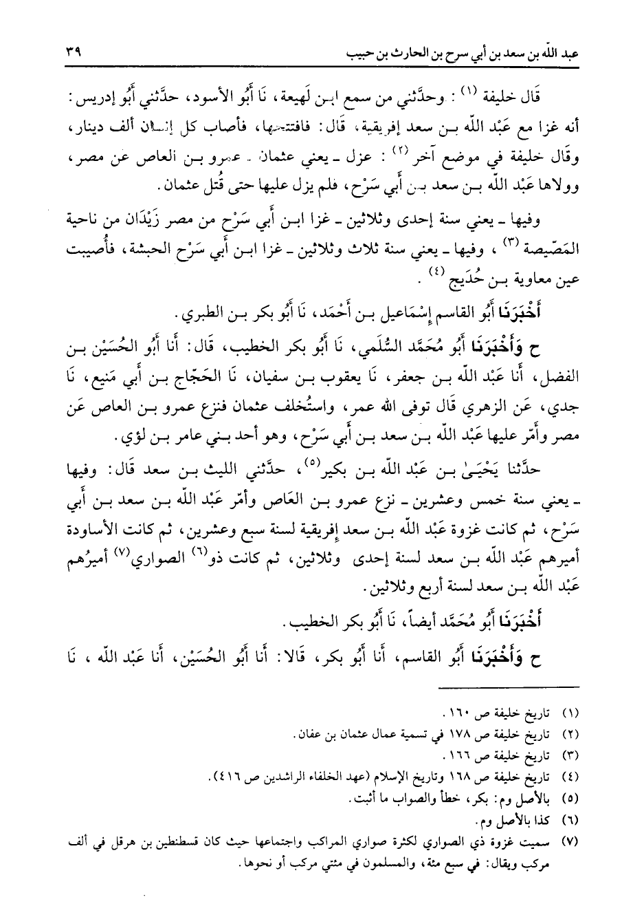 قال خليفة (1) وحدثني من سمع ابن لهيعة نا أبو الأسود حدثني أبو إدريس أنه غزا مع عبد الله بن سعد إفريقية قال فافتتحها فأصاب كل إنسان ألف دينار وقال خليفة في موضع آخر (2) عزل يعني عثمان عمرو بن العاص عن مصر وولاها عبد الله بن سعد بن أبي سرح فلم يزل عليها حتى قتل عثمان وفيها يعني سنة إحدى وثلاثين غزا ابن أبي سرح من مصر زيدان من ناحية المصيصة (3) وفيها يعني سنة ثلاث وثلاثين غزا ابن أبي سرح الحبشة فأصيبت عين معاوية بن حديج (4) أخبرنا أبو القاسم إسماعيل بن أحمد نا أبو بكر بن الطبري ح وأخبرنا أبو محمد السلمي نا أبو بكر الخطيب قال أنا أبو الحسين بن الفضل أنا عبد الله بن جعفر نا يعقوب بن سفيان نا الحجاج بن أبي منيع نا جدي عن الزهري قال توفى الله عمر واستخلف عثمان فنزع عمرو بن العاص عن مصر وأمر عليها عبد الله بن سعد بن أبي سرح وهو أحد بني عامر بن لؤي حدثنا يحيى بن عبد الله بن بكير (5) حدثني الليث بن سعد قال وفيها يعني سنة خمس وعشرين نزع عمرو بن العاص وأمر عبد الله بن سعد بن أبي سرح ثم كانت غزوة عبد الله بن سعد إفريقية لسنة سبع وعشرين ثم كانت الأساودة أميرهم عبد الله بن سعد لسنة إحدى وثلاثين ثم كانت ذو (6) الصواري (7) أميرهم عبد الله بن سعد لسنة أربع وثلاثين أخبرنا أبو محمد أيضا نا أبو بكر الخطيب ح وأخبرنا أبو القاسم أنا أبو بكر قالا أنا أبو الحسين أنا عبد الله نا