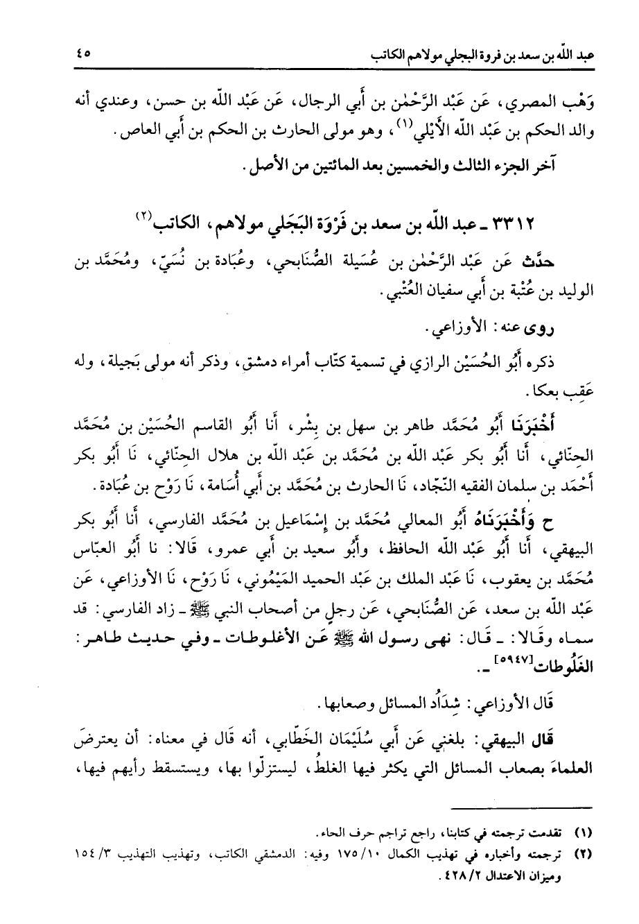 3312 - عبد الله بن سعد بن فروة البجلي مولاهم الكاتب (2) حدث عن عبد الرحمن بن عسيلة الصنابحي وعبادة بن نسي ومحمد بن الوليد بن عتبة بن أبي سفيان العتبي روى عنه الأوزاعي ذكره أبو الحسين الرازي في تسمية كتاب أمراء دمشق وذكر أنه مولى بجلية وله عقب بعكا أخبرنا أبو محمد طاهر بن سهل بن بشر أنا أبو القاسم الحسين بن محمد الحنائي أنا أبو بكر عبد الله بن محمد بن عبد الله بن هلال الحنائي نا أبو بكر أحمد بن سلمان الفقيه النجاد نا الحارث بن محمد بن أبي أسامة نا روح بن عبادة ح وأخبرناه أبو المعالي محمد بن إسماعيل بن محمد الفارسي أنا أبو بكر البيهقي أنا أبو عبد الله الحافظ وأبو سعيد بن أبي عمرو قالا نا أبو العباس محمد بن يعقوب نا عبد الملك بن عبد الحميد الميموني نا روح نا الأوزاعي عن عبد الله بن سعد عن الصنابحي عن رجل من أصحاب النبي (صلى الله عليه وسلم) زاد الفارسي قد سماه وقالا قال نهى رسول الله (صلى الله عليه وسلم) عن الأغلوطات وفي حديث طاهر الغلوطات قال الأوزاعي شداد المسائل وصعابها قال البيهقي بلغني عن أبي سليمان الخطابي أنه قال في معناه أن يعترض العلماء بصعاب المسائل التي يكثر فيها الغلط ليستزلوا بها ويستسقط رأيهم فيها