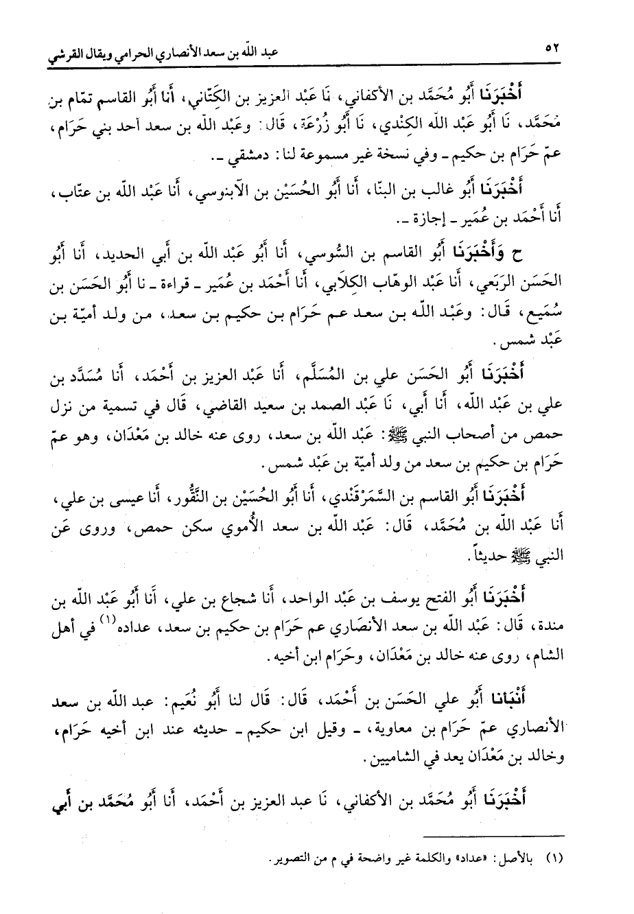 أخبرنا أبو محمد بن الأكفاني نا عبد العزيز بن الكتاني أنا أبو القاسم تمام بن محمد نا أبو عبد الله الكندي نا أبو زرعة قال وعبد الله بن سعد أحد بني حرام عم حرام بن حكيم وفي نسخة غير مسموعة لنا دمشقي أخبرنا أبو غالب بن البنا أنا أبو الحسين بن الآبنوسي أنا عبد الله بن عتاب أنا أحمد بن عمير إجازة ح وأخبرنا أبو القاسم بن السوسي أنا أبو عبد الله بن أبي الحديد أنا أبو الحسن الربعي أنا عبد الوهاب الكلابي أنا أحمد بن عمير قراءة نا أبو الحسن بن سميع قال وعبد الله بن سعد عم حرام بن حكيم بن سعد من ولد أمية بن عبد شمس أخبرنا أبو الحسن علي بن المسلم أنا عبد العزيز بن أحمد أنا مسدد بن علي بن عبد الله أنا أبي نا عبد الصمد بن سعيد القاضي قال في تسمية من نزل حمص من أصحاب النبي (صلى الله عليه وسلم) عبد الله بن سعد روى عنه خالد بن معدان وهو عم حرام بن حكيم بن سعد من ولد أمية بن عبد شمس أخبرنا أبو القاسم بن السمرقندي أنا أبو الحسين بن النقور أنا عيسى بن علي أنا عبد الله بن محمد قال عبد الله بن سعد الأموي سكن حمص وروى عن النبي (صلى الله عليه وسلم) حديثا أخبرنا أبو الفتح يوسف بن عبد الواحد أنا شجاع بن علي أنا أبو عبد الله بن مندة قال عبد الله بن سعد الأنصاري عم حرام بن حكيم بن سعد عداده (1) في أهل الشام روى عنه خالد بن معدان وحرام ابن أخيه أنبأنا أبو علي الحسن بن أحمد قال قال لنا أبو نعيم عبد الله بن سعد الأنصاري عم حرام بن معاوية وقيل ابن حكيم حديثه عند ابن أخيه حرام وخالد بن معدان يعد في الشاميين أخبرنا أبو محمد بن الأكفاني نا عبد العزيز بن أحمد أنا أبو محمد بن أبي
