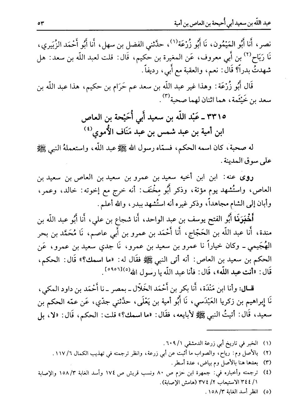 3315 - عبد الله بن سعيد أبي أحيحة بن العاص بن أمية بن عبد شمس بن عبد مناف الأموي (4) له صحبة كان اسمه الحكم فسماه رسول الله (صلى الله عليه وسلم) عبد الله واستعمله النبي (صلى الله عليه وسلم) على سوق المدينة روى عنه ابن ابن أخيه سعيد بن عمرو بن سعيد بن العاص بن سعيد بن العاص واستشهد يوم مؤتة وذكر أبو مخنف أنه خرج مع اخوته خالد وعمر وأبان إلى الشام مجاهدا وذكر غيره أنه استشهد ببدر والله أعلم أخبرنا أبو الفتح يوسف بن عبد الواحد أنا شجاع بن علي أنا أبو عبد الله بن مندة أنا عبد الله بن الحجاج أنا أحمد بن عمرو بن أبي عاصم نا محمد بن بحر الهجيمي وكان خيارا نا عمرو بن سعيد بن عمرو نا جدي سعيد بن عمرو عن الحكم بن سعيد بن العاص أنه أتى النبي (صلى الله عليه وسلم) فقال له ما اسمك قال الحكم قال أنت عبد الله قال فأنا عبد الله يا سول الله (5)