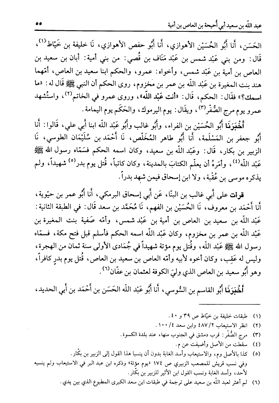 الحسن أنا أبو الحسين الأهوازي أنا أبو حفص الأهوازي نا خليفة بن خياط (1) قال ومن بني عبد شمس بن عبد مناف بن قصي من بني أمية أبان بن سعيد بن العاص بن أمية بن عبد شمس وأخواه عمرو والحكم ابنا سعيد بن العاص أمهما هند بنت المغيرة بن عبد الله بن عمر بن مخزوم روى الحكم أن النبي (صلى الله عليه وسلم) قال له ما اسمك فقال الحكم قال أنت عبد الله وروى عمرو في الخاتم (2) واستشهد عمرو يوم مرج الصفر (3) ويقال يوم اليرموك والحكم يوم اليمامة أخبرنا أبو الحسين بن الفراء وأبو غالب وأبو عبد الله ابنا أبي علي قالوا أنا أبو جعفر بن المسلمة أنا أبو طاهر المخلص نا أحمد بن سليمان الطوسي نا الزبير بن بكار قال وعبد الله بن سعيد وكان اسمه الحكم فسماه رسول الله (صلى الله عليه وسلم) عبد الله (4) وأمره أن يعلم الكتاب بالمدينة وكان كاتبا قتل يوم بدر (5) شهيدا ولم يذكره موسى بن عقبة ولا ابن إسحاق فيمن شهد بدرا قرأت على أبي غالب بن البنا عن أبي إسحاق البرمكي أنا أبو عمر بن حيوية أنا أحمد بن معروف نا الحسين بن الفهم نا محمد بن سعد قال في الطبقة الثانية عبد الله بن سعيد بن العاص بن أمية بن عبد شمس وأمه صفية بنت المغيرة بن عبد الله بن عمر بن مخزوم وكان عبد الله اسمه الحكم فأسلم قبل فتح مكة فسماه رسول الله (صلى الله عليه وسلم) عبد الله وقتل يوم مؤتة شهيدا في جمادى الأولى سنة ثمان من الهجرة وليس له عقب وكان أخوه لأبيه وأمه العاص بن سعيد بن العاص قتل يوم بدر كافرا وهو أبو سعيد بن العاص الذي ولي الكوفة لعثمان بن عفان (6) أخبرنا أبو القاسم بن السوسي أنا أبو عبد الله الحسن بن أحمد بن أبي الحديد