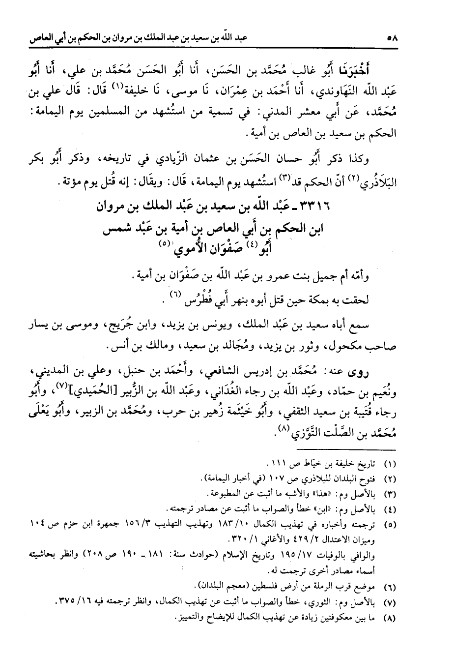 أخبرنا أبو غالب محمد بن الحسن أنا أبو الحسن محمد بن علي أنا أبو عبد الله النهاوندي أنا أحمد بن عمران نا موسى نا خليفة (1) قال قال علي بن محمد عن أبي معشر المدني في تسمية من استشهد من المسلمين يوم اليمامة الحكم بن سعيد بن العاص بن أمية وكذا ذكر أبو حسان الحسن بن عثمان الزيادي في تاريخه وذكر أبو بكر البلاذري (2) أن الحكم قد (3) استشهد يوم اليمامة قال ويقال إنه قتل يوم مؤتة