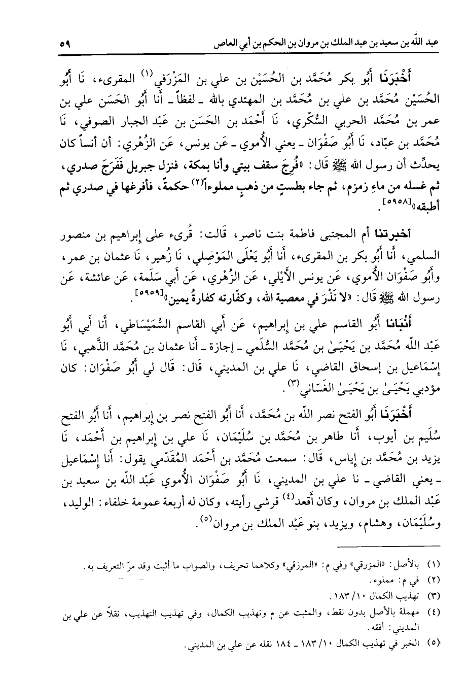 [5959] أنبأنا أبو القاسم علي بن إبراهيم عن أبي القاسم السميساطي أنا أبي أبو عبد الله محمد بن يحيى بن محمد السلمي إجازة أنا عثمان بن محمد الذهبي نا إسماعيل بن إسحاق القاضي نا علي بن المديني قال قال لي أبو صفوان كان مؤدبي يحيى بن يحيى الغساني (3) أخبرنا أبو الفتح نصر الله بن محمد أنا أبو الفتح نصر بن إبراهيم أنا أبو الفتح سليم بن أيوب أنا طاهر بن محمد بن سليمان نا علي بن إبراهيم بن أحمد نا يزيد بن محمد بن إياس قال سمعت محمد بن أحمد المقدمي يقول أنا إسماعيل يعني القاضي نا علي بن المديني نا أبو صفوان الأموي عبد الله بن سعيد بن عبد الملك بن مروان وكان أقعد (4) قرشي رأيته وكان له أربعة عمومة خلفاء الوليد وسليمان وهشام ويزيد بنو عبد الملك بن مروان (5)