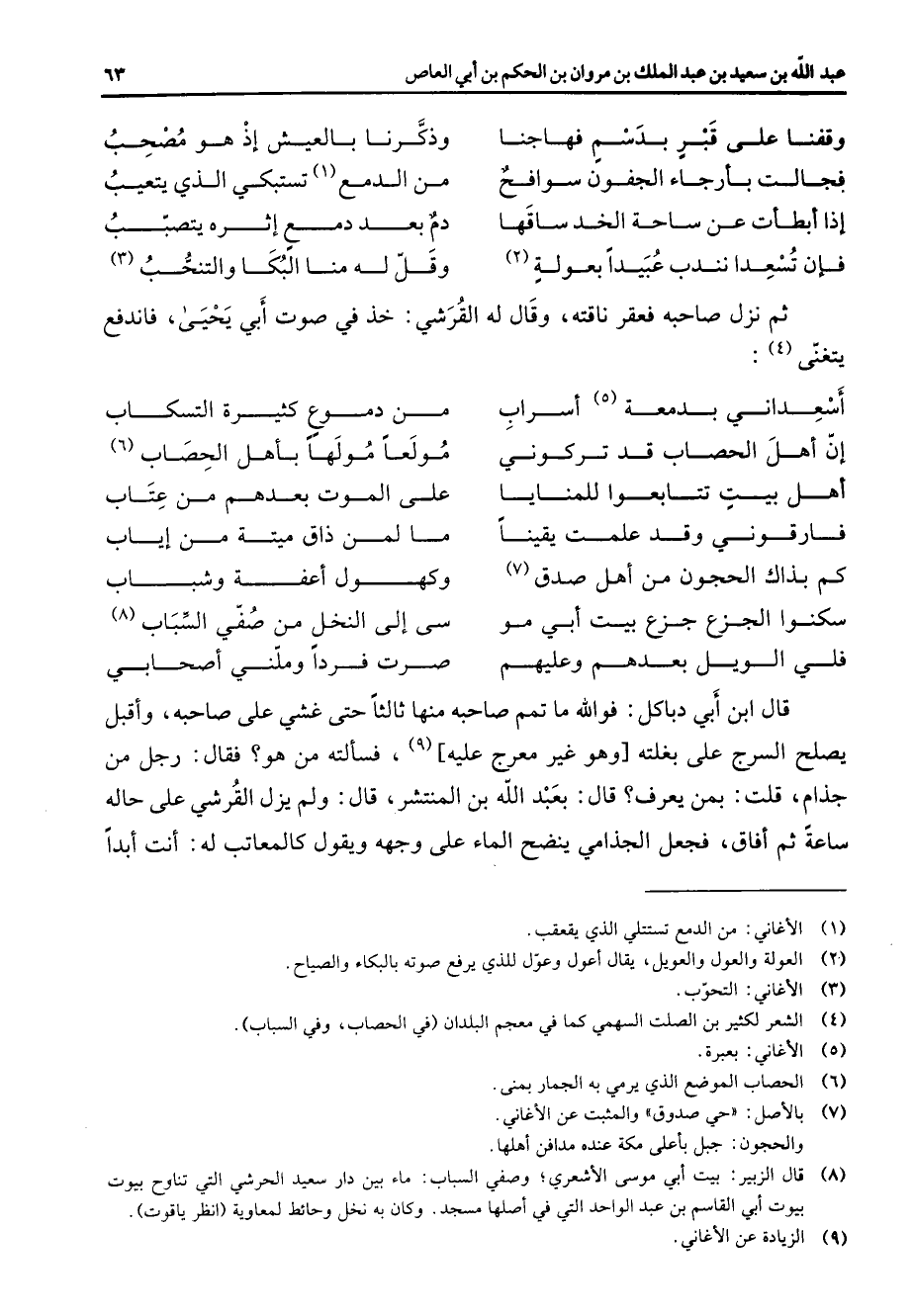 * وقفنا على قبر بدسم فهاجنا * وذكرنا بالعيش إذ هو مصحب فجالت بأرجاء الجفون سوافح * من الدمع (1) تستبكي الذي يتعيب إذا أبطأت عن ساحة الخد ساقها * دم بعد دمع إثره يتصبب * فإن تسعد نندب عبيدا بعولة (2) * وقل له منا البكاء والتنحب (3) * ثم نزل صاحبه فعقر ناقته وقال له القرشي خذ في صوت أبي يحيى فاندفع يتغنى (4) * أسعداني بدمعة (5) أسراب * من دموع كثيرة التسكاب إن أهل الحصاب قد تركوني * مولعا مولها بأهل الحصاب (6) أهل بيت تتابعوا للمنايا * على الموت بعدهم من عتاب فارقوني وقد علمت يقينا * ما لمن ذاق ميتة من إياب كم بذاك الحجون من أهل صدق (7) * وكهول أعفة وشباب سكنوا الجزع جزع بيت أبي مو * سى إلى النخل من صفي السباب (8) فلي الويل بعدهم وعليهم * صرت فردا وملني أصحابي * قال ابن أبي دباكل فوالله ما تمم صاحبه منها ثالثا حتى غشي على صاحبه وأقبل يصلح السرج على بغلته وهو غير معرج عليه (9) فسألته من هو فقال رجل من جذام قلت بمن يعرف قال بعبد الله بن المنتشر قال ولم يزل القرشي على حاله ساعة ثم أفاق فجعل الجذامي ينضح الماء على وجهه ويقول كالمعاتب له أنت أبدا