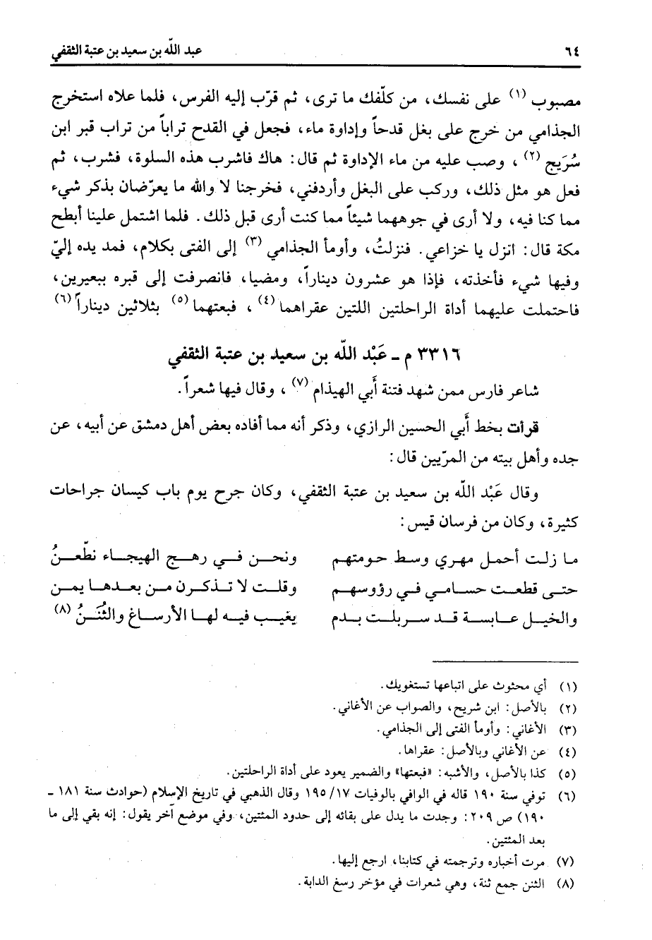 مصبوب (1) على نفسك من كلفك ما ترى ثم قرب إليه الفرس فلما علاه استخرج الجذامي من خرج على بغل قدحا وإداوة ماء فجعل في القدح ترابا من تراب قبر ابن سريج (2) وصب عليه من ماء الإداوة ثم قال هاك فاشرب هذه السلوة فشرب ثم فعل هو مثل ذلك وركب على البغل وأردفني فخرجنا لا والله ما يعرضان بذكر شئ مما كنا فيه ولا أرى في جوههما شيئا مما كنت أرى قبل ذلك فلما اشتمل علينا أبطح مكة قال انزل يا خزاعي فنزلت وأومأ الجذامي (3) إلى الفتى بكلام فمد يده إلي وفيها شئ فأخذته فإذا هو عشرون دينارا ومضيا فانصرفت إلى قبره ببعيرين فاحتملت عليهما أداة الراحلتين اللتين عقراهما (4) فبعتهما (5) بثلاثين دينارا (6) 3316 م عبد الله بن سعيد بن عتبة الثقفي شاعر فارس ممن شهد فتنة أبي الهيذام (7) وقال فيها شعرا قرأت بخط أبي الحسين الرازي وذكر أنه مما أفاده بعض أهل دمشق عن أبيه عن جده وأهل بيته من المريين قال وقال عبد الله بن سعيد بن عتبة الثقفي وكان جرح يوم باب كيسان جراحات كثيرة وكان من فرسان قيس * ما زلت أحمل مهري وسط حومتهم * ونحن في رهج الهيجاء نطعن حتى قطعت حسامي في رؤوسهم * وقلت لا تذكرن من بعدها يمن * * والخيل عابسة قد سربلت بدم * يغيب فيه لها الأرساغ والثنن (8) *