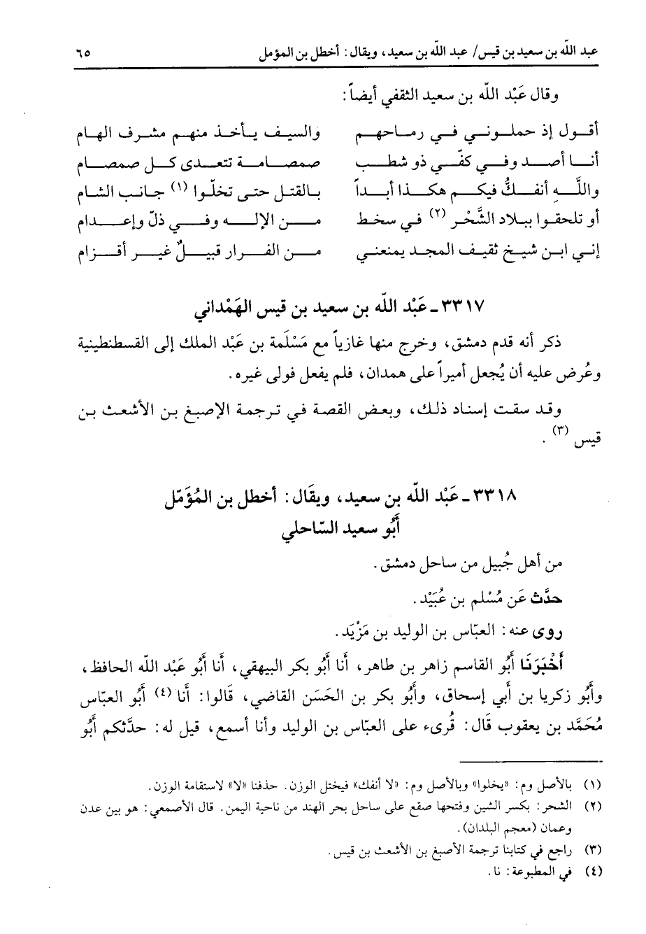 3317 - عبد الله بن سعيد بن قيس الهمداني ذكر أنه قدم دمشق وخرج منها غازيا مع مسلمة بن عبد الملك إلى القسطنطينية وعرض عليه أن يجعل أميرا على همدان فلم يفعل فولى غيره وقد سقت إسناد ذلك وبعض القصة في ترجمة الإصبغ بن الأشعث بن قيس (3)