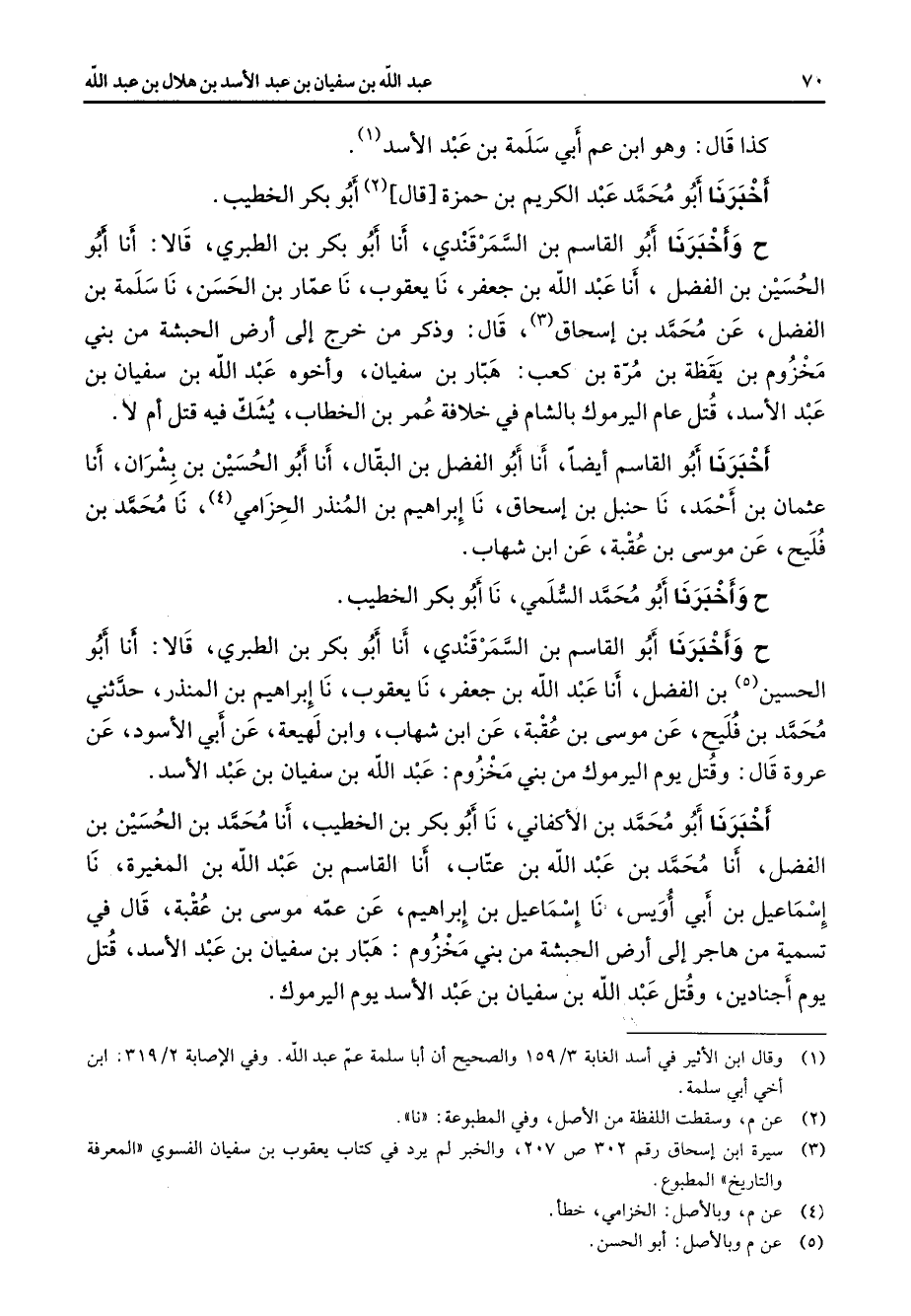 كذا قال وهو ابن عم أبي سلمة بن عبد الأسد (1) أخبرنا أبو محمد عبد الكريم بن حمزة قال (2) أبو بكر الخطيب ح وأخبرنا أبو القاسم بن السمرقندي أنا أبو بكر بن الطبري قالا أنا أبو الحسين بن الفضل أنا عبد الله بن جعفر نا يعقوب نا عمار بن الحسن نا سلمة بن الفضل عن محمد بن إسحاق (3) قال وذكر من خرج إلى أرض الحبشة من بني مخزوم بن يقظة بن مرة بن كعب هبار بن سفيان وأخوه عبد الله بن سفيان بن عبد الأسد قتل عام اليرموك بالشام في خلافة عمر بن الخطاب يشك فيه قتل أم لا أخبرنا أبو القاسم أيضا أنا أبو الفضل بن البقال أنا أبو الحسين بن بشران أنا عثمان بن أحمد نا حنبل بن إسحاق نا إبراهيم بن المنذر الحزامي نا محمد بن فليح عن موسى بن عقبة عن ابن شهاب ح وأخبرنا أبو محمد السلمي نا أبو بكر الخطيب ح وأخبرنا أبو القاسم بن السمرقندي أنا أبو بكر بن الطبري قالا أنا أبو الحسين (5) بن الفضل أنا عبد الله بن جعفر نا يعقوب نا إبراهيم بن المنذر حدثني محمد بن فليح عن موسى بن عقبة عن ابن شهاب وابن لهيعة عن أبي الأسود عن عروة قال وقتل يوم اليرموك من بني مخزوم عبد الله بن سفيان بن عبد الأسد أخبرنا أبو محمد بن الأكفاني نا أبو بكر بن الخطيب أنا محمد بن الحسين بن الفضل أنا محمد بن عبد الله بن عتاب أنا القاسم بن عبد الله بن المغيرة نا إسماعيل بن أبي أويس نا إسماعيل بن إبراهيم عن عمه موسى بن عقبة قال في تسمية من هاجر إلى أرض الحبشة من بني مخزوم هبار بن سفيان بن عبد الأسد قتل يوم أجنادين وقتل عبد الله بن سفيان بن عبد الأسد يوم اليرموك