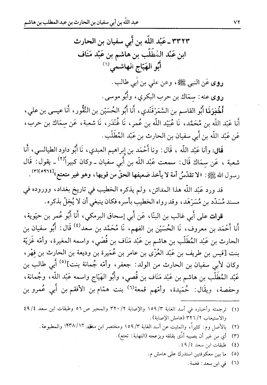 3323 - عبد الله بن أبي سفيان بن الحارث بن عبد المطلب بن هاشم بن عبد مناف أبو الهياج الهاشمي (1) روى عن النبي (صلى الله عليه وسلم) وعن علي بن أبي طالب روى عنه سماك بن حرب البكري وأبو موسى أخبرنا أبو القاسم بن السمرقندي أنا أبو الحسين بن النقور أنا عيسى بن علي أنا عبد الله بن محمد نا عبيد الله بن عمر نا غندر نا شعبة عن سماك بن حرب عن عبد الله بن أبي سفيان بن الحارث بن عبد المطلب قال وأنا عبد الله قال ونا أحمد بن إبراهيم العبدي نا أبو داود الطيالسي أنا شعبة عن سماك قال سمعت عبد الله بن أبي سفيان وكان كبيرا (2) يقول قال رسول الله (صلى الله عليه وسلم) لا تقدس أمة لا يأخذ ضعيفها الحق من قويها وهو غير متعتع