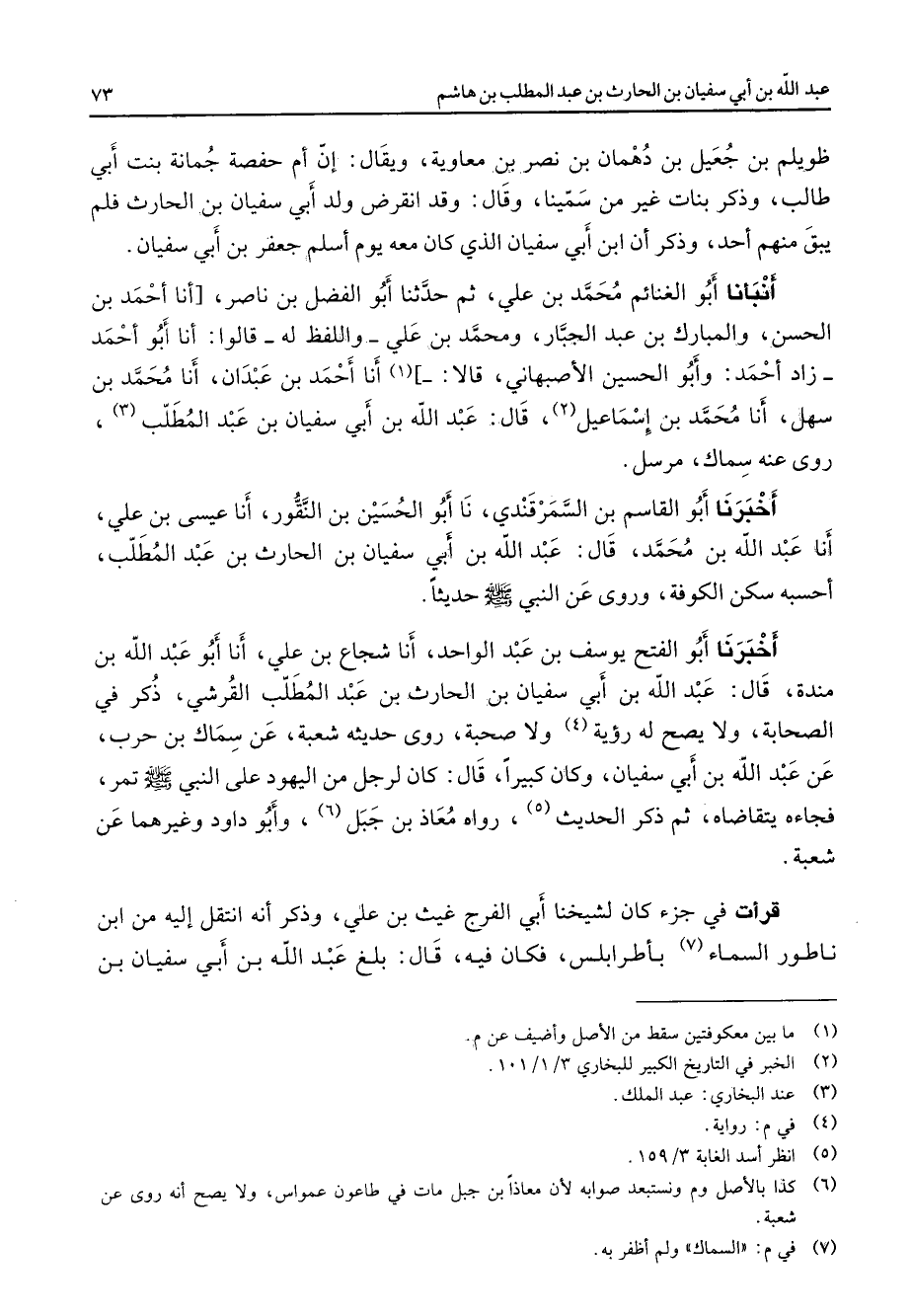 ظويلم بن جعيل بن دهمان بن نصر بن معاوية ويقال إن أم حفصة جمانة بنت أبي طالب وذكر بنات غير من سمينا وقال وقد انقرض ولد أبي سفيان بن الحارث فلم يبق منهم أحد وذكر أن ابن أبي سفيان الذي كان معه يوم أسلم جعفر بن أبي سفيان أنبأنا أبو الغنائم محمد بن علي ثم حدثنا أبو الفضل بن ناصر أنا أحمد بن الحسن والمبارك بن عبد الجبار ومحمد بن علي واللفظ له قالوا أنا أبو أحمد زاد أحمد وأبو الحسين الأصبهاني قالا (1) أنا أحمد بن عبدان أنا محمد بن سهل أنا محمد بن إسماعيل (2) قال عبد الله بن أبي سفيان بن عبد المطلب (3) روى عنه سماك مرسل أخبرنا أبو القاسم بن السمرقندي نا أبو الحسين بن النقور أنا عيسى بن علي أنا عبد الله بن محمد قال عبد الله بن أبي سفيان بن الحارث بن عبد المطلب أحسبه سكن الكوفة وروى عن النبي (صلى الله عليه وسلم) حديثا أخبرنا أبو الفتح يوسف بن عبد الواحد أنا شجاع بن علي أنا أبو عبد الله بن مندة قال عبد الله بن أبي سفيان بن الحارث بن عبد المطلب القرشي ذكر في الصحابة ولا يصح له رؤية (4) ولا صحبة روى حديثه شعبة عن سماك بن حرب عن عبد الله بن أبي سفيان وكان كبيرا قال كان لرجل من اليهود على النبي (صلى الله عليه وسلم) تمر فجاءه يتقاضاه ثم ذكر الحديث (5) رواه معاذ بن جبل (6) وأبو داود وغيرهما عن شعبة قرأت في جزء كان لشيخنا أبي الفرج غيث بن علي وذكر أنه انتقل إليه من ابن ناطور السماء (7) بأطرابلس فكان فيه قال بلغ عبد الله بن أبي سفيان بن