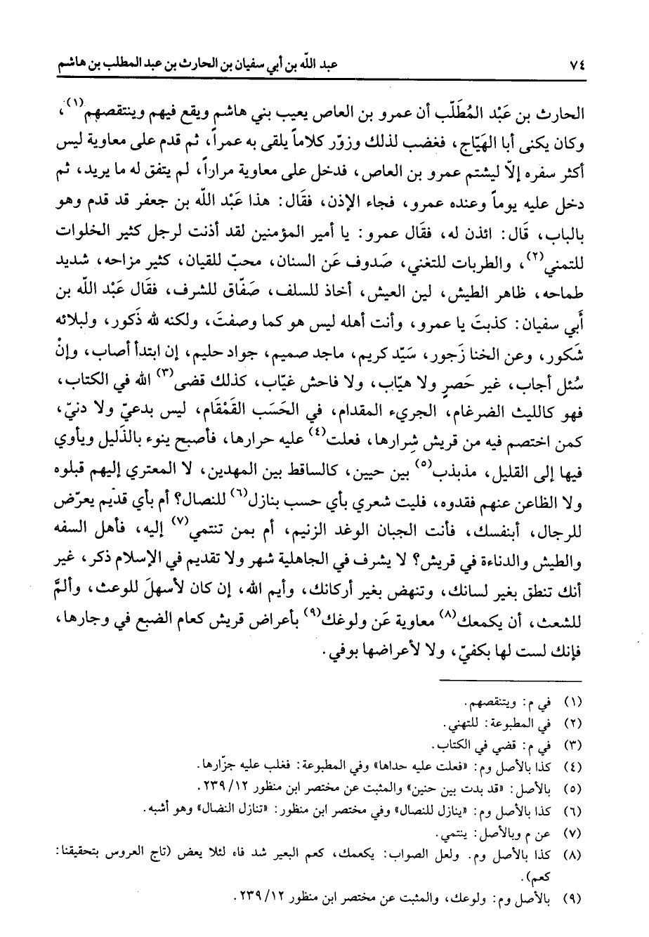 الحارث بن عبد المطلب أن عمرو بن العاص يعيب بني هاشم ويقع فيهم وينتقصهم (1) وكان يكنى أبا الهياج فغضب لذلك وزور كلاما يلقى به عمرا ثم قدم على معاوية ليس أكثر سفره إلا ليشتم عمرو بن العاص فدخل على معاوية مرارا لم يتفق له ما يريد ثم دخل عليه يوما وعنده عمرو فجاء الإذن فقال هذا عبد الله بن جعفر قد قدم وهو بالباب قال ائذن له فقال عمرو يا أمير المؤمنين لقد أذنت لرجل كثير الخلوات للتمني (2) والطربات للتغني صدوف عن السنان محب للقيان كثير مزاحه شديد طماحه ظاهر الطيش ليس العيش أخاذ للسلف صفاق للشرف فقال عبد الله بن أبي سفيان كذبت يا عمرو وأنت أهله ليس هو كما وصفت ولكنه لله ذكور ولبلائه شكور وعن الخنا زجور سيد كريم ماجد صميم جواد حليم إن ابتدأ أصاب وإن سئل أجاب غير حصر ولا هياب ولا فاحش غياب كذلك قضى (3) الله في الكتاب فهو كالليث الضرغام الجرئ المقدام في الحسب القمقام ليس بدعي ولا دني كمن اختصم فيه من قريش شرارها فعلت (4) عليه حرارها فأصبح ينوء بالذليل ويأوي فيها إلى القليل مذبذب (5) بين حيين كالساقط بين المهدين لا المعتري إليهم قبلوه ولا الظاعن عنهم فقدوه فليت شعري بأي حسب بنازل (6) للنصال أم بأي قديم يعرض للرجال أبنفسك فأنت الجبان الوغد الزنيم أم بمن تنتمي (7) إليه فأهل السفه والطيش والدناءة في قريش لا يشرف في الجاهلية شهر ولا تقديم في الإسلام ذكر غير أنك تنطق بغير لسانك وتنهض بغير أركانك وأيم الله إن كان لأسهل للوعث وألم للشعث أن يكمعك (8) معاوية عن ولوغك (9) بأعراض قريش كعام الضبع في وجارها فإنك لست لها بكفي ولا لأعراضها بوفي