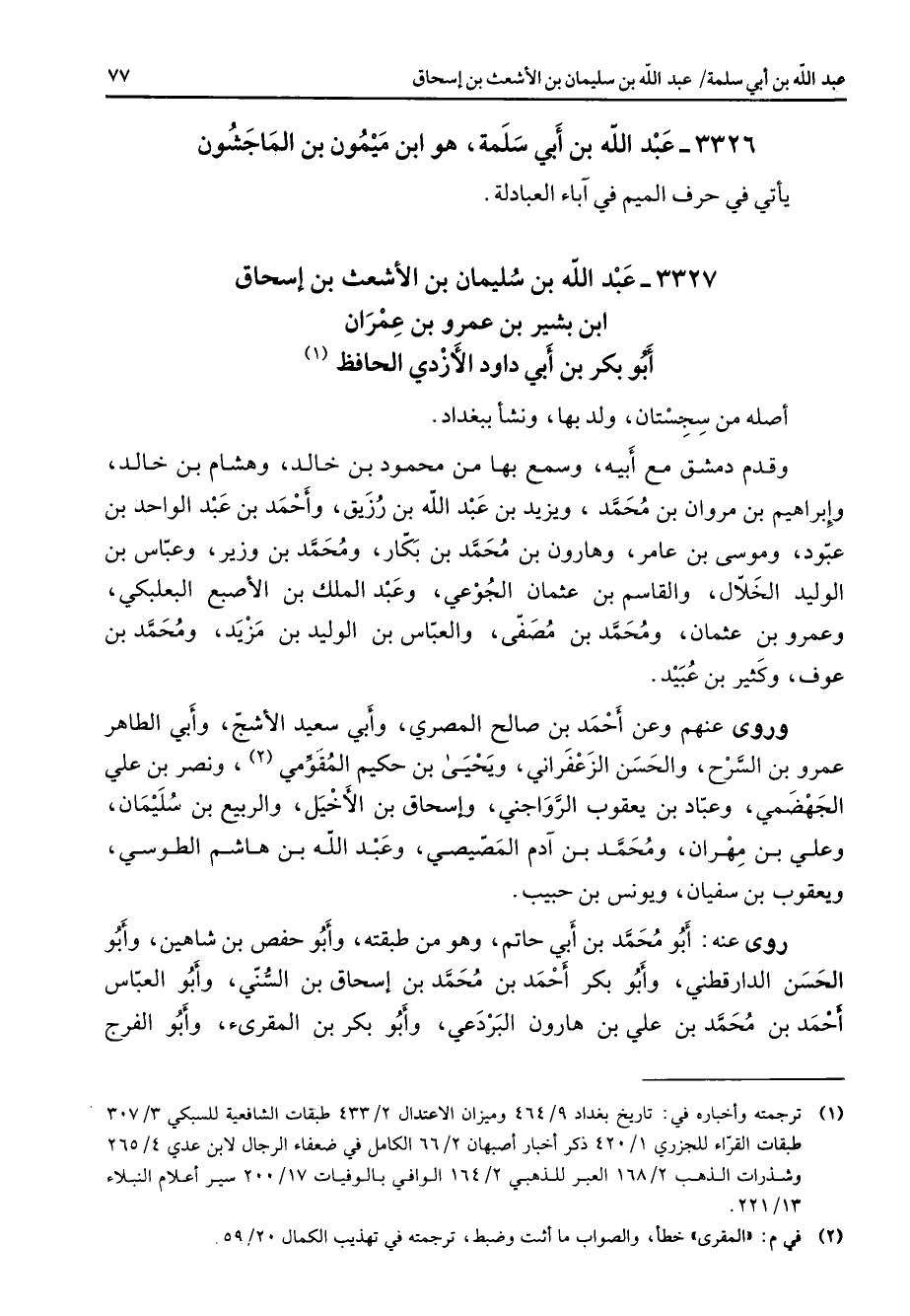 3327 - عبد الله بن سليمان بن الأشعث بن إسحاق بن بشير بن عمرو بن عمران أبو بكر ابن أبي داود الأزدي الحافظ (1) أصله من سجستان ولد بها ونشأ ببغداد وقدم دمشق مع أبيه وسمع بها من محمود بن خالد وهشام بن خالد وإبراهيم بن مروان بن محمد ويزيد بن عبد الله بن رزيق وأحمد بن عبد الواحد بن عبود وموسى بن عامر وهارون بن محمد بن بكار ومحمد بن وزير وعباس بن الوليد الخلال والقاسم بن عثمان الجوعي وعبد الملك بن الأصبع البعلبكي وعمرو بن عثمان ومحمد بن مصفى والعباس بن الوليد بن مزيد ومحمد بن عوف وكثير بن عبيد وروى عنهم وعن أحمد بن صالح المصري وأبي سعيد الأشج وأبي الطاهر عمرو بن السرح والحسن الزعفراني ويحيى بن حكيم المقومي (2) ونصر بن علي الجهضمي وعباد بن يعقوب الرواجني وإسحاق بن الأخيل والربيع بن سليمان وعلي بن مهران ومحمد بن آدم المصيصي وعبد الله بن هاشم الطوسي ويعقوب بن سفيان ويونس بن حبيب روى عنه أبو محمد بن أبي حاتم وهو من طبقته وأبو حفص بن شاهين وأبو الحسن الدارقطني وأبو بكر أحمد بن محمد بن إسحاق بن السني وأبو العباس أحمد بن محمد بن علي بن هارون البردعي وأبو بكر بن المقرئ وأبو الفرج