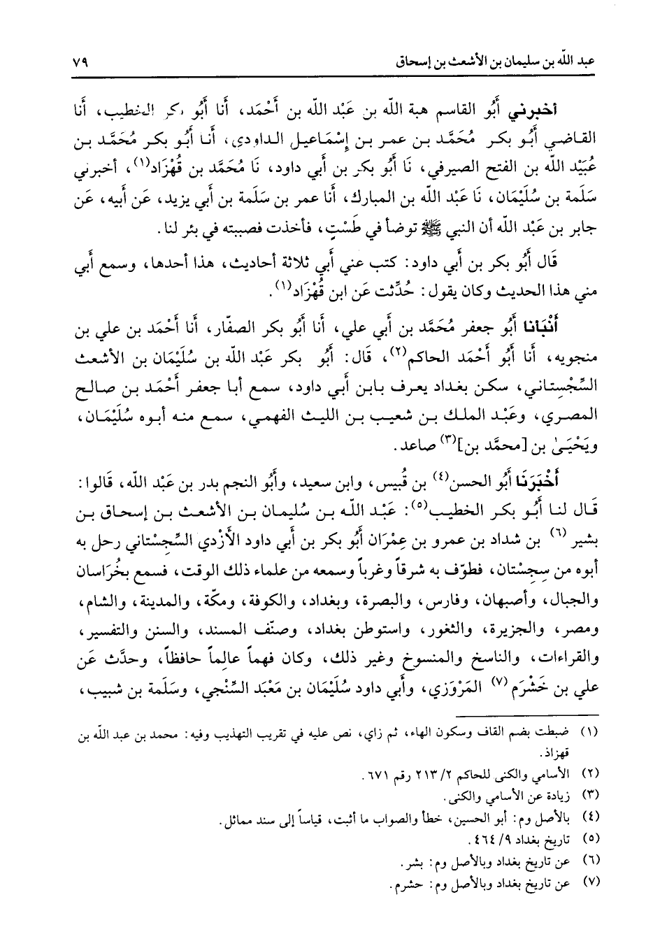 أخبرني أبو القاسم هبة الله بن عبد الله بن أحمد أنا أبو بكر الخطيب أنا القاضي أبو بكر محمد بن عمر بن إسماعيل الداودي أنا أبو بكر محمد بن عبيد الله بن الفتح الصيرفي نا أبو بكر بن أبي داود نا محمد بن قهزاد (1) أخبرني سلمة بن سليمان نا عبد الله بن المبارك أنا عمر بن سلمة بن أبي يزيد عن أبيه عن جابر بن عبد الله أن النبي (صلى الله عليه وسلم) توضأ في طست فأخذت فصببته في بئر لنا قال أبو بكر بن أبي داود كتب عني أبي ثلاثة أحاديث هذا أحدها وسمع أبي مني هذا الحديث وكان يقول حدثت عن ابن قهزاد (1) أنبأنا أبو جعفر محمد بن ابي علي أنا أبو بكر الصفار أنا أحمد بن علي بن منجويه أنا أبو أحمد الحاكم (2) قال أبو بكر عبد الله بن سليمان بن الأشعث السجستاني سكن بغداد يعرف بابن أبي داود سمع أبا جعفر أحمد بن صالح المصري وعبد الملك بن شعيب بن الليث الفهمي سمع منه أبوه سليمان ويحيى بن محمد بن (3) صاعد أخبرنا أبو الحسن (4) بن قبيس وابن سعيد وأبو النجم بدر بن عبد الله قالوا قال لنا أبو بكر الخطيب (5) عبد الله بن سليمان بن الأشعث بن إسحاق بن بشير (6) بن شداد بن عمرو بن عمران أبو بكر بن أبي داود الأزدي السجستاني رحل به أبوه من سجستان فطوف به شرقا وغربا وسمعه من علماء ذلك الوقت فسمع بخراسان والجبال وأصبهان وفارس والبصرة وبغداد والكوفة ومكة والمدينة والشام ومصر والجزيرة والثغور واستوطن بغداد وصنف المسند والسنن والتفسير والقراءات والناسخ والمنسوخ وغير ذلك وكان فهما عالما حافظا وحدث عن علي بن خشرم (7) المروزي وأبي داود سليمان بن معبد السنجي وسلمة بن شبيب
