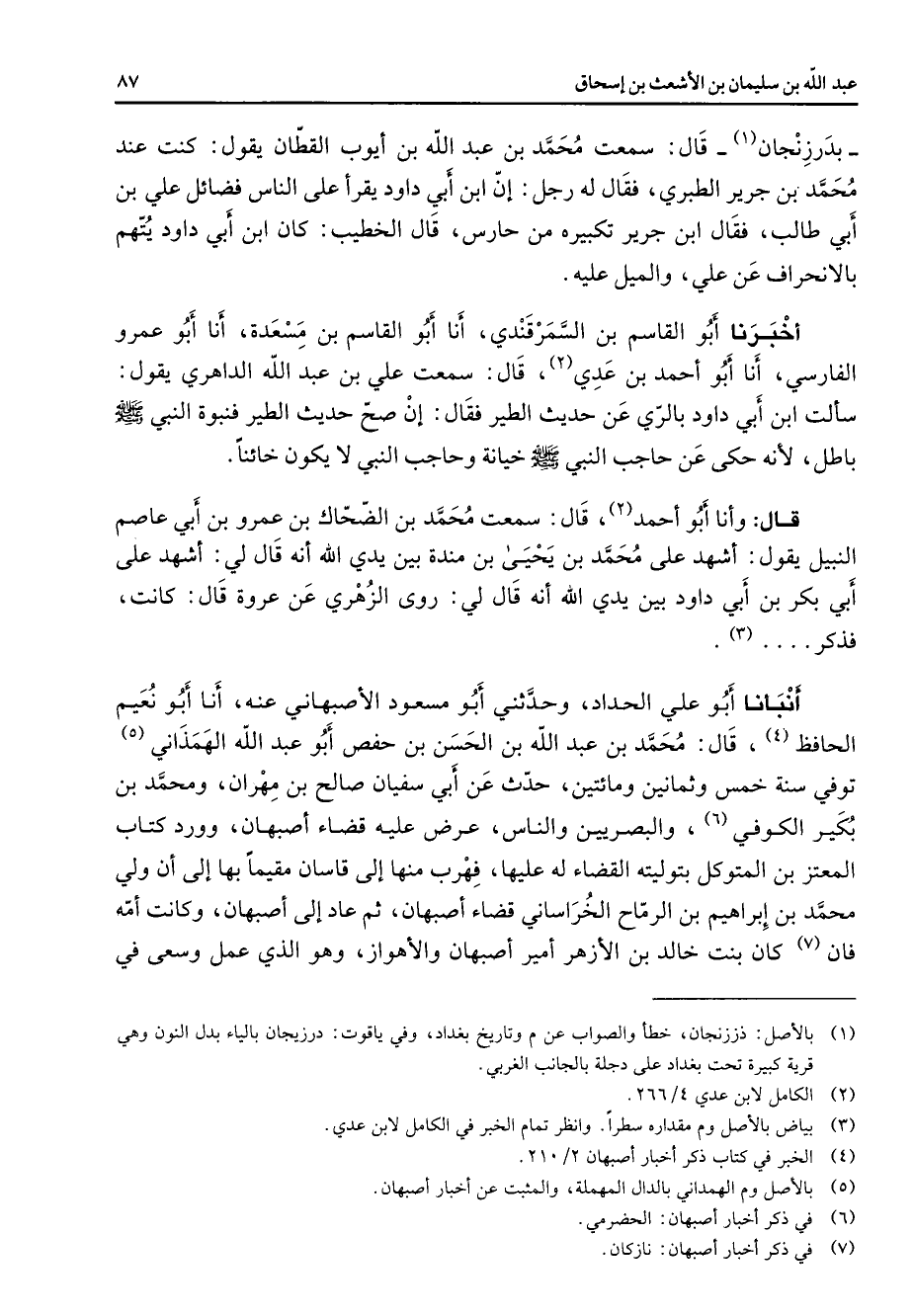 بدرزنجان (1) قال سمعت محمد بن عبد الله بن أيوب القطان يقول كنت عند محمد بن جرير الطبري فقال له رجل إن ابن أبي داود يقرأ على الناس فضائل علي بن أبي طالب فقال ابن جرير تكبيره من حارس قال الخطيب كان ابن أبي داود يتهم بالانحراف عن علي والميل عليه أخبرنا أبو القاسم بن السمرقندي أنا أبو القاسم بن مسعدة أنا أبو عمرو الفارسي أنا أبو أحمد بن عدي (2) قال سمعت علي بن عبد الله الداهري يقول سألت ابن أبي داود بالري عن حديث الطير فقال إن صح حديث الطير فنبوة النبي (صلى الله عليه وسلم) باطل لأنه حكى عن حاجب النبي (صلى الله عليه وسلم) خيانة وحاجب النبي لا يكون خائنا قال وأنا أبو أحمد (2) قال سمعت محمد بن الضحاك بن عمرو بن أبي عاصم النبيل يقول أشهد على محمد بن يحيى بن مندة بين يدي الله أنه قال لي أشهد على أبي بكر بن أبي داود بين يدي الله أنه قال لي روى الزهري عن عروة قال كانت فذكر