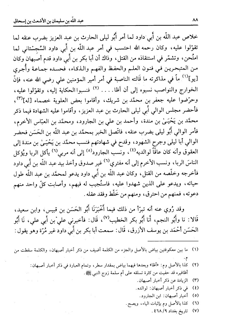 خلاص عبد الله بن أبي داود لما أمر أبو ليلى الحارث بن عبد العزيز بضرب عنقه لما تقولوا عليه وكان رحمه الله احتسب في أمر عبد الله بن أبي داود السجستاني لما امتحن وتشمر في استنقاذه من القتل وذاك أن أبا بكر بن أبي داود قدم أصبهان وكان من المتبحرين في فنون العلم والحفظ والفهم والذكاء فحسده جماعة وأجري (يو) (1) ما في مذكراته ما قالته الناصبة في أمر أمير المؤمنين علي Bهـ فإن الخوارج والنواصب نسبوه إلى أن أظا